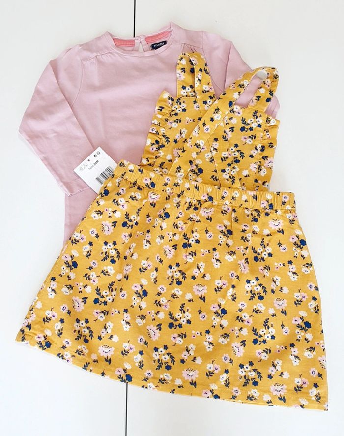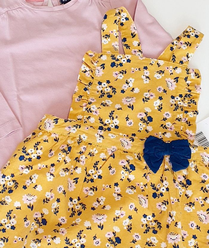 Ensemble avec robe en velours jaune/marine/rose (neuve avec etiquette) et haut ML rose Kiabi - Taille 24 mois