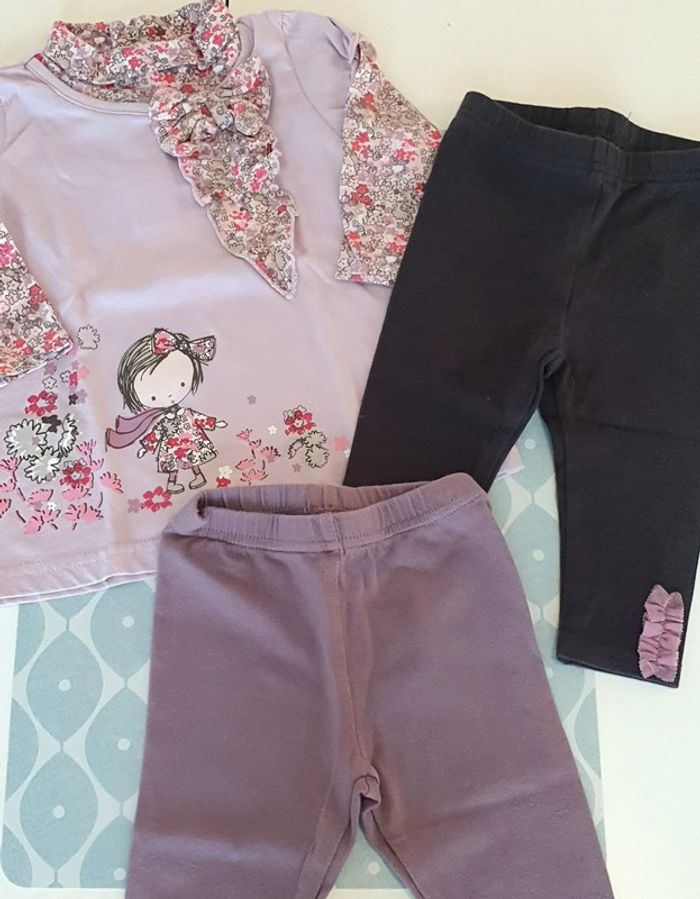 Ensemble avec haut ML parme + 2 leggings gris foncé et violet - Taille 6 mois
