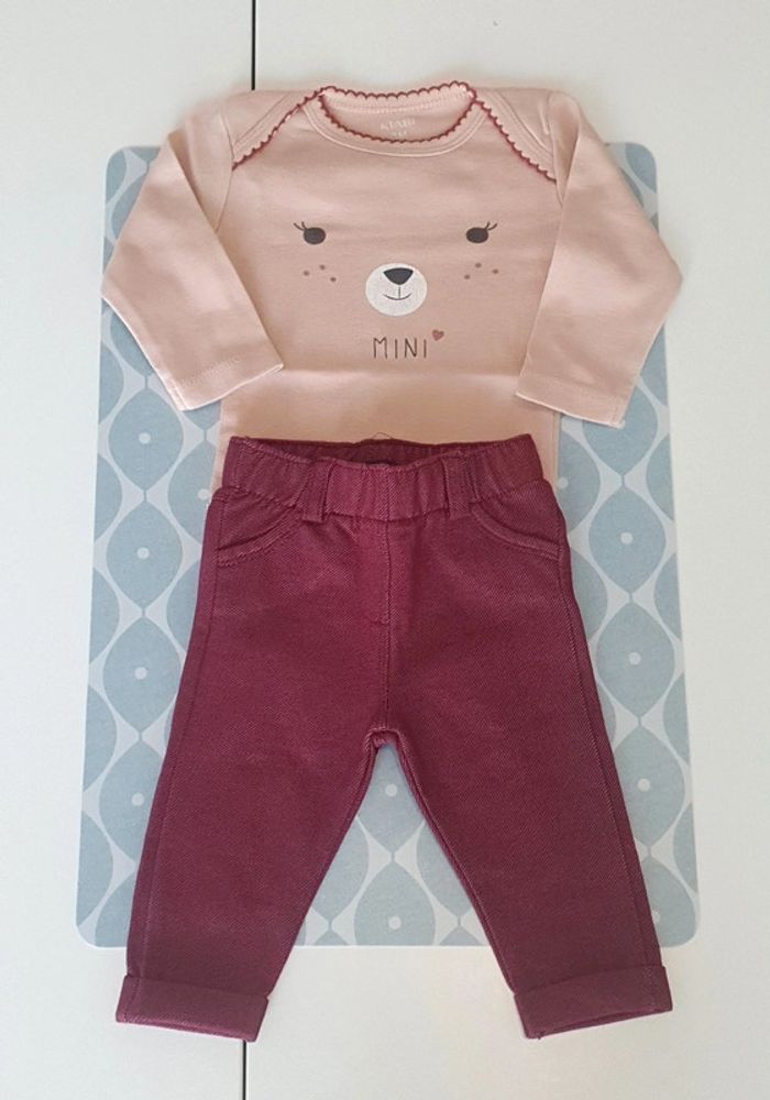 Ensemble Kiabi avec pantalon bordeaux et body ML rose/saumon - Taille 3 mois