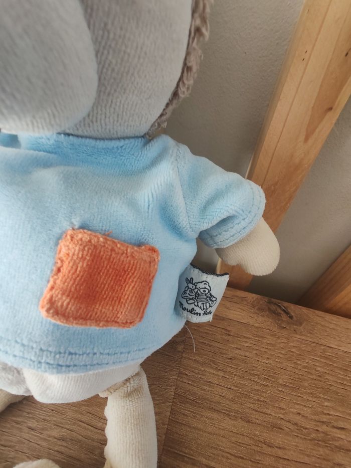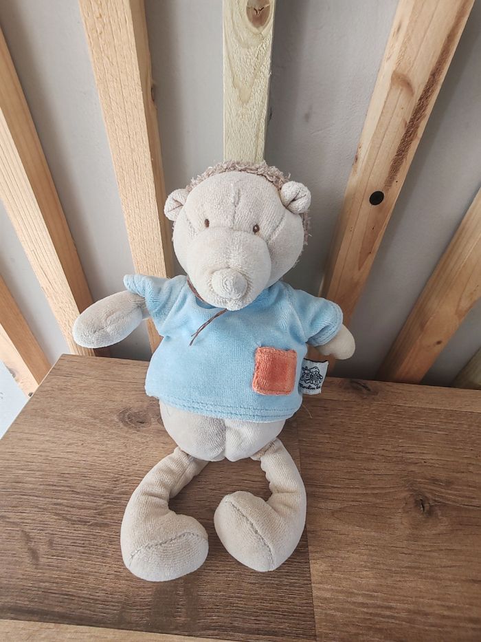 Moulin Roty Doudou Herisson 28 cm environ Il est beige et porte un t shirt bleu claire Étiquette marque présente À noté un petit défaut que la couture au niveau de sa tête détail en photo 9.90.euros Envoi en relais