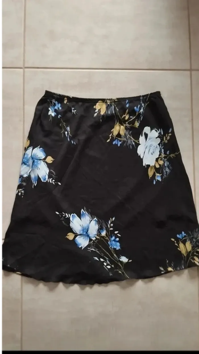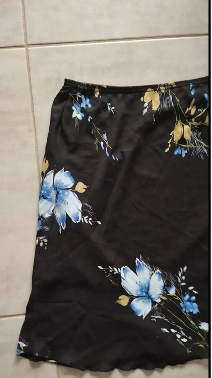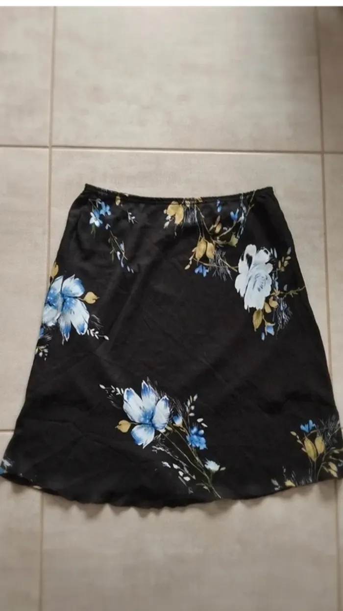 Jupe mi longue noir avec fleurs taille 42/44 Mesure a plat 42 a la taille Longueur 70 cm Taille élastique