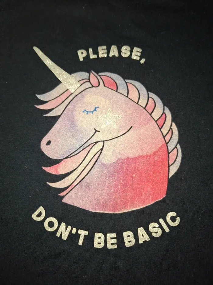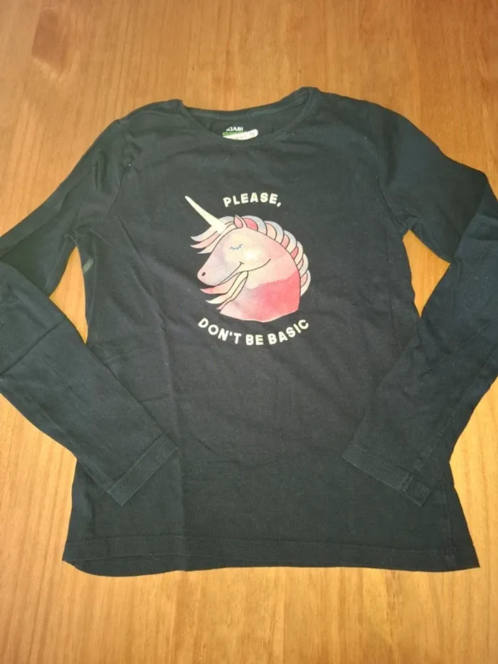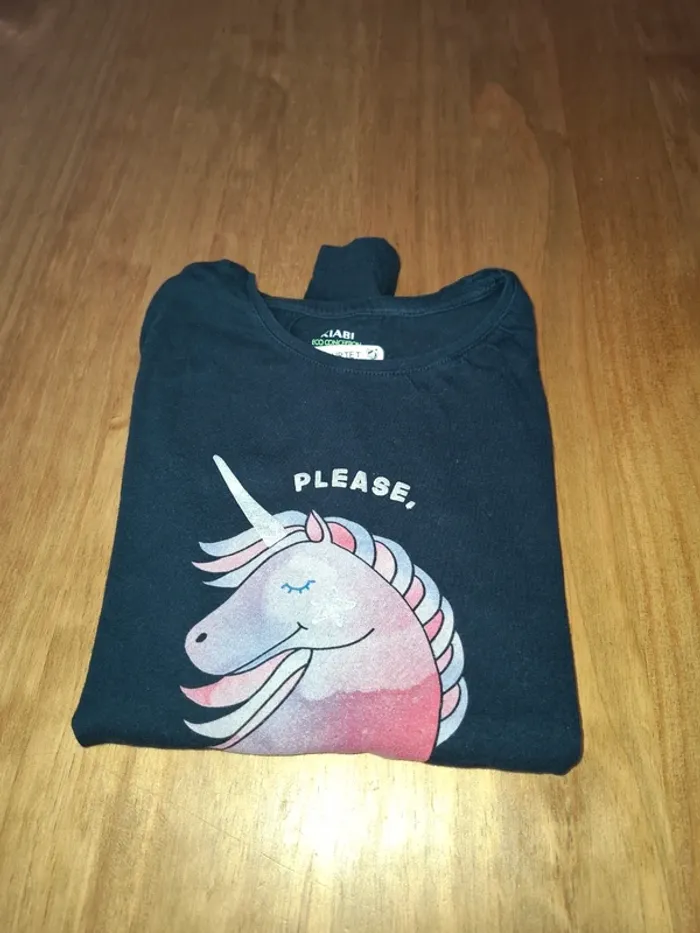 T-shirt manches longues bleu marine avec motif licorne en TBE. Taille 10 ans Marque Kiabi #10anssevy57