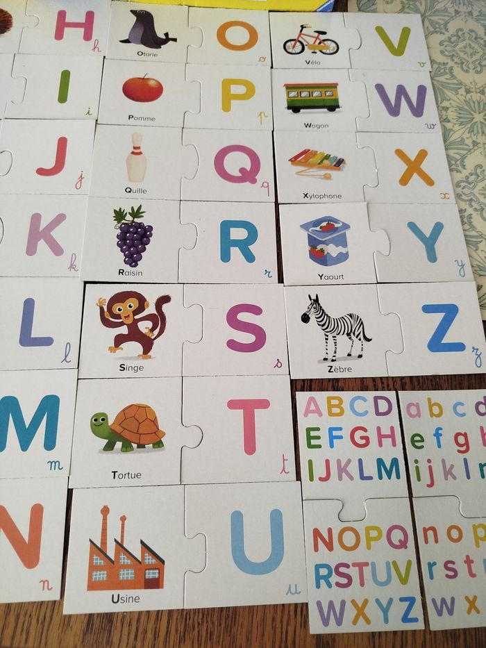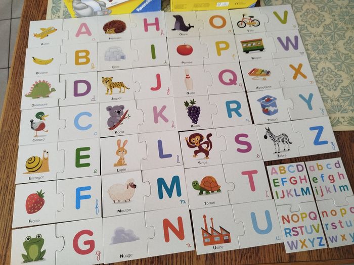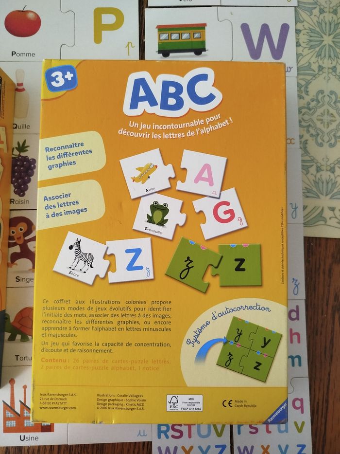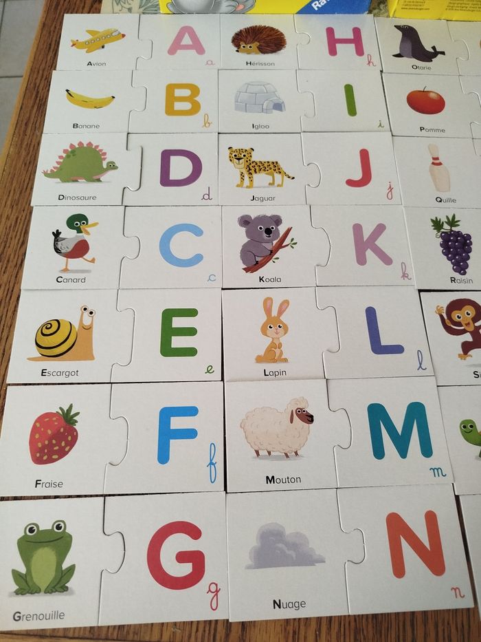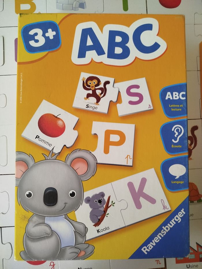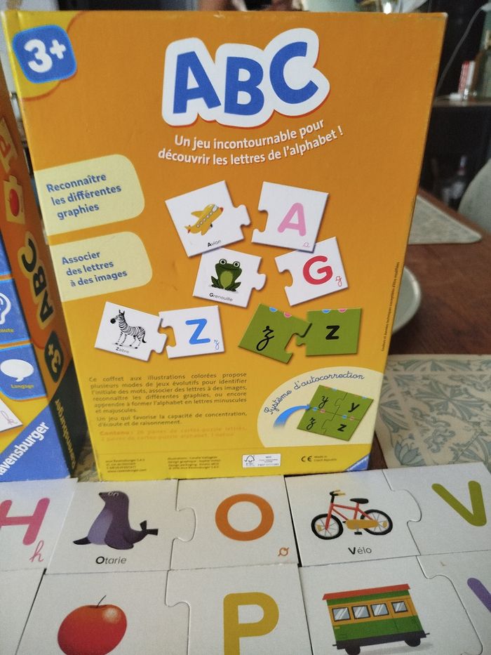 Jeux éducatifs A,B ,C LETTRE ET LECTURE ÉCOUTE LANGAGE CE COFFRET AUX ILLUSTRATIONS COLORÉES PROPOSE PLUSIEURS MODES DE JEUX ÉVOLUTIFS POUR IDENTIFIER L'INITIAL DES MOTS, ASSOCIÉ DES LETTRES À DES IMAGES, RECONNAÎTRE LES DIFFÉRENTES GRAPHIES, OU ENCORE APPRENDRE À FORMER L'ALPHABET EN LETTRE MINUSCULE OU EN MAJUSCULE UN JEU QUI FAVORISE LA CAPACITÉ DE CONCENTRATION D'ÉCOUTE ET DE RAISONNEMENT JEUX DE CARTES RECTO VERSO MARQUE : RAVENSBURGER ÂGE : 3 ANS ÉTAT : EXCELLENT ÉTAT proche du neuf Complet : OUI N'hésitez pas à jeter un coup d'œil dans mon dressing, je fais le tri dans mes placards. Si vous achetez 2 articles=-15% 3 articles =20% et 5 articles= 25%