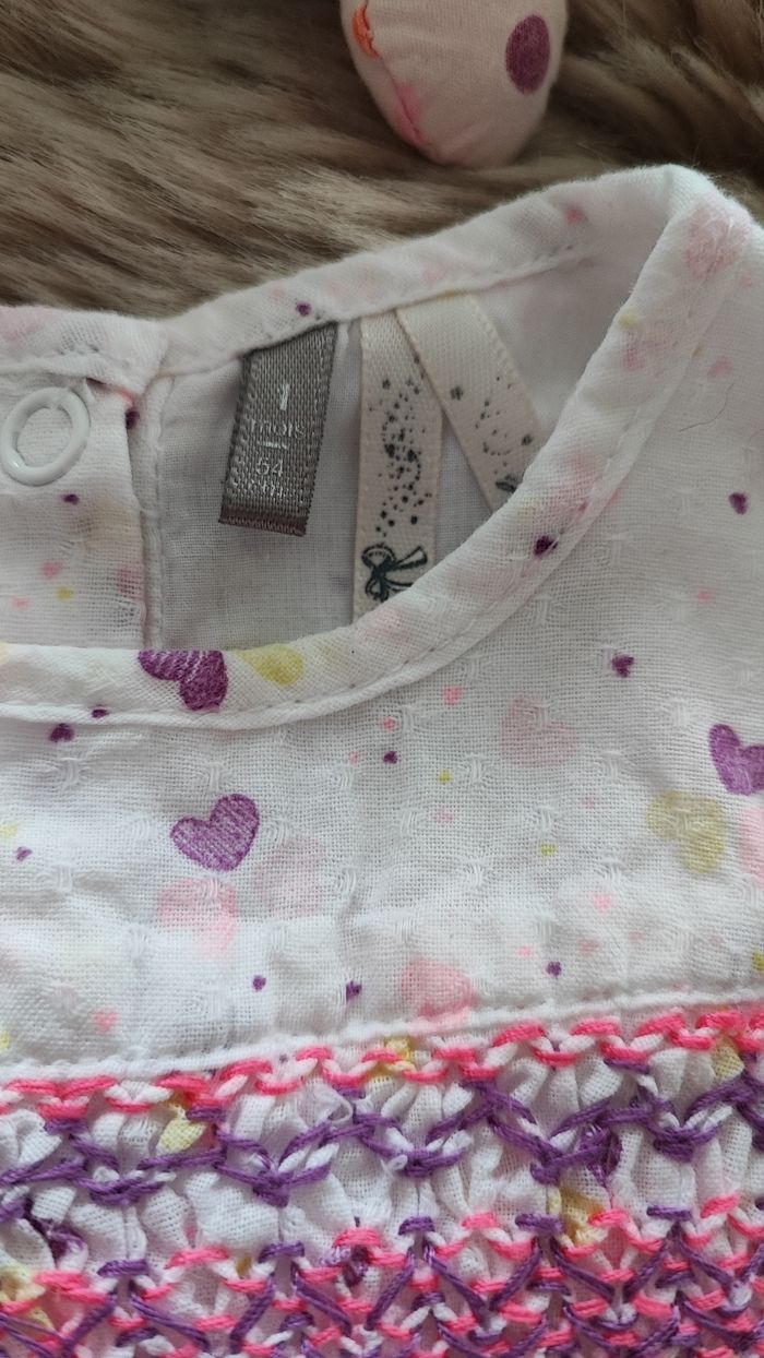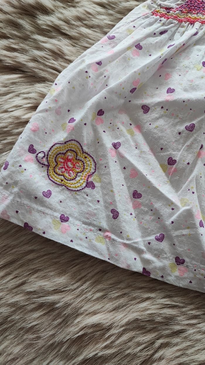 Robe blanche, rose et violet avec des coeurs. Pressions dans le dos. De la marque orchestra En taille 1 mois En très bon état maison non fumeur #laetitia33700filleunmois