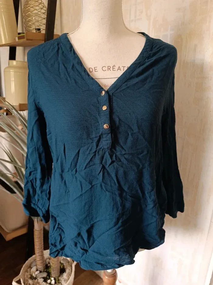 Blouse ATMOSPHÈRE Bleu Col V avec boutons dorés 100% Viscose TAILLE 42 BON ETAT Allez voir mes autres ventes!
