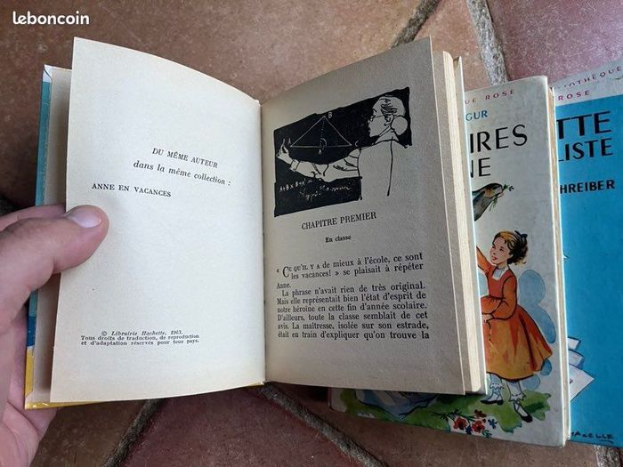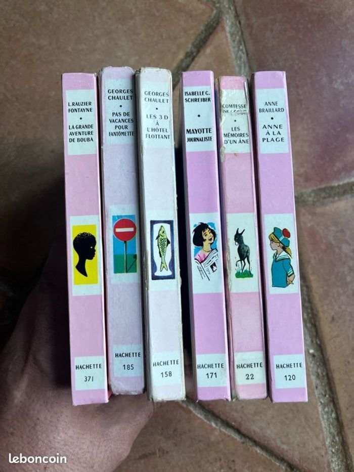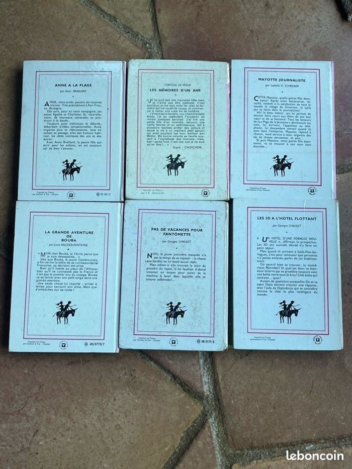 Vends 6 livres de la série la « Nouvelle Bibliothèque Rose », Hachette. Le prix est celui du lot qui pèse 1104g. Possibilité à l’unité me demander. Photos sur demande. Les titres sont : - Anne à la plage (1970): excellent état - les mémoires d’un âne (1961): couverture marquée, scotch mis sur pages car décollées, table de matière déchirée sur 2cm, sinon intérieur frais. Bel exemplaire - Mayotte journaliste (1964): excellent état général - les 3D à l’hôtel flottant (1964): couverture légèrement marquée notamment sur tranche mais rien d’important. Il manque certains angles de pages déchirés, sinon intérieur très bon état. Très bel exemplaire - pas de vacances pour Fantômette (1968): couverture marquée notamment sur tranche mais rien d’important. Une page présente une déchirure. Sinon intérieur très frais. Bel exemplaire - les grandes aventures de Bouba (1981): excellent état Idéal pour les enfants, nostalgiques ou collectionneurs