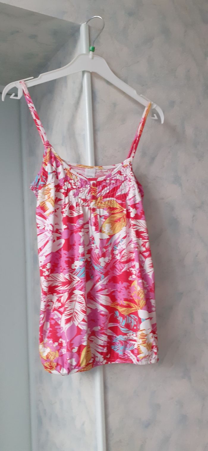 Vends un top à bretelles court, froncé à la base et sur la poitrine, en viscose et élasthanne, couleurs rouge, rose et jaune, marque Camaïeu, taille 36. Longueur sous aisselle : 46 cm Largeur aisselle à aisselle : 40 cm.