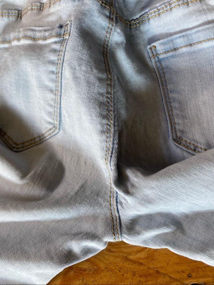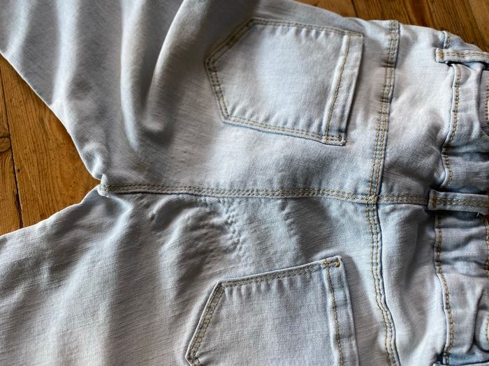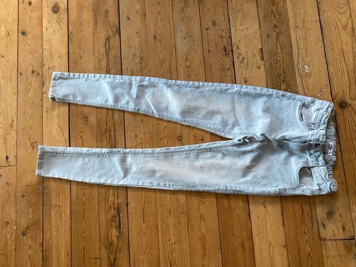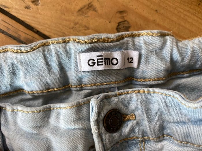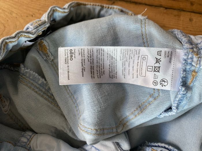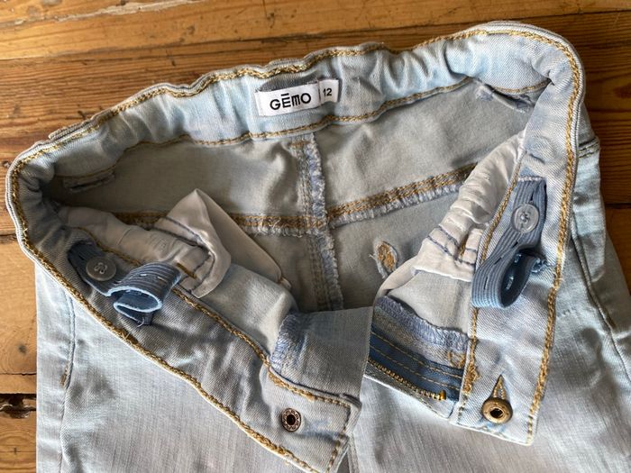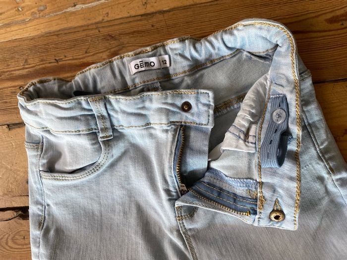 Jeans skinny bleu clair Fermeture par pression et réglable à la Ceinture Bon état car elasthane détendu sur les fesses mais se voit beaucoup moins quand c'est porté Taille 12 ans 47 % coton, 28 % polyester, 23 % viscose 2 % elasthane Gémo
