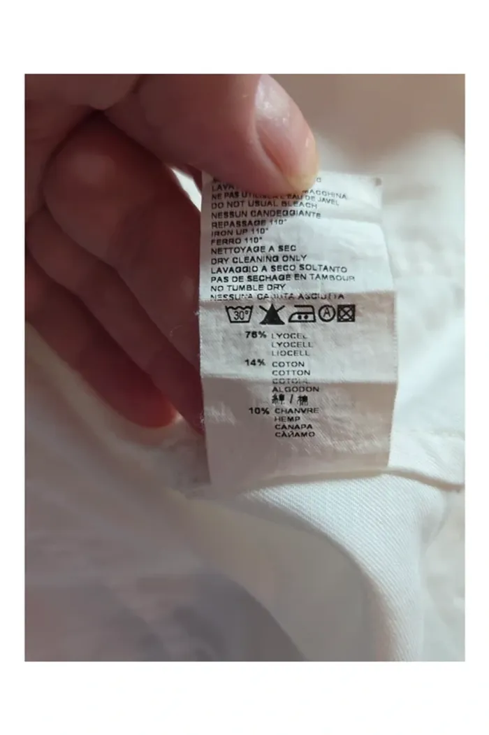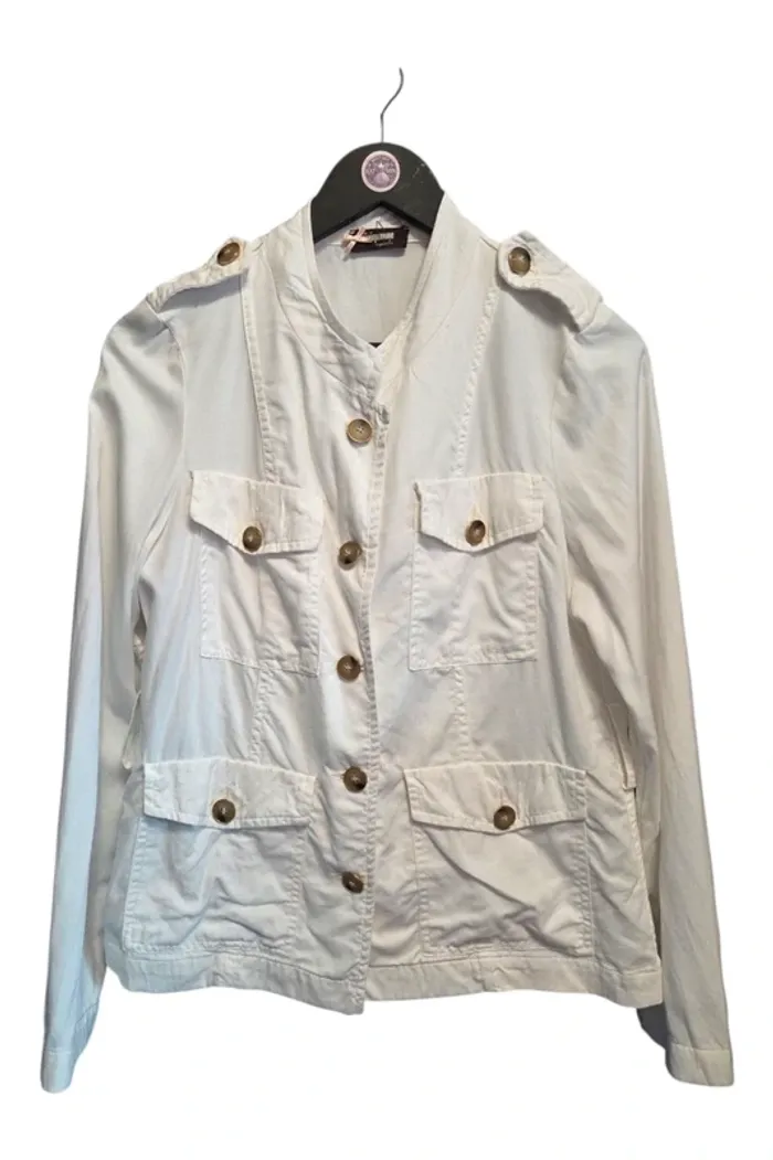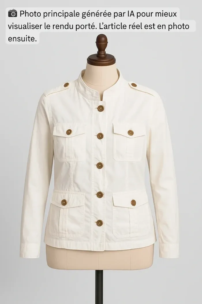 📸 Photo principale générée par IA pour mieux visualiser le rendu porté. ⚠️ Le modèle réel peut légèrement différer. Merci de bien consulter les photos suivantes pour voir l’article réel. Vend Belle veste blanche, bon état, juste une petite tâche au niveau de l'épaule, voir photos 📷. Coton, chanvre, lyocell. Longueur milieu dos 60cm Largeur d'aisselle à aisselle 49cm PAS D'ENVOI VINTED GO! #vestefemme42 #bellevestefemme42 #vesteblanche42 #sinequanone42 #femme42 #laboutiquedekatmin42