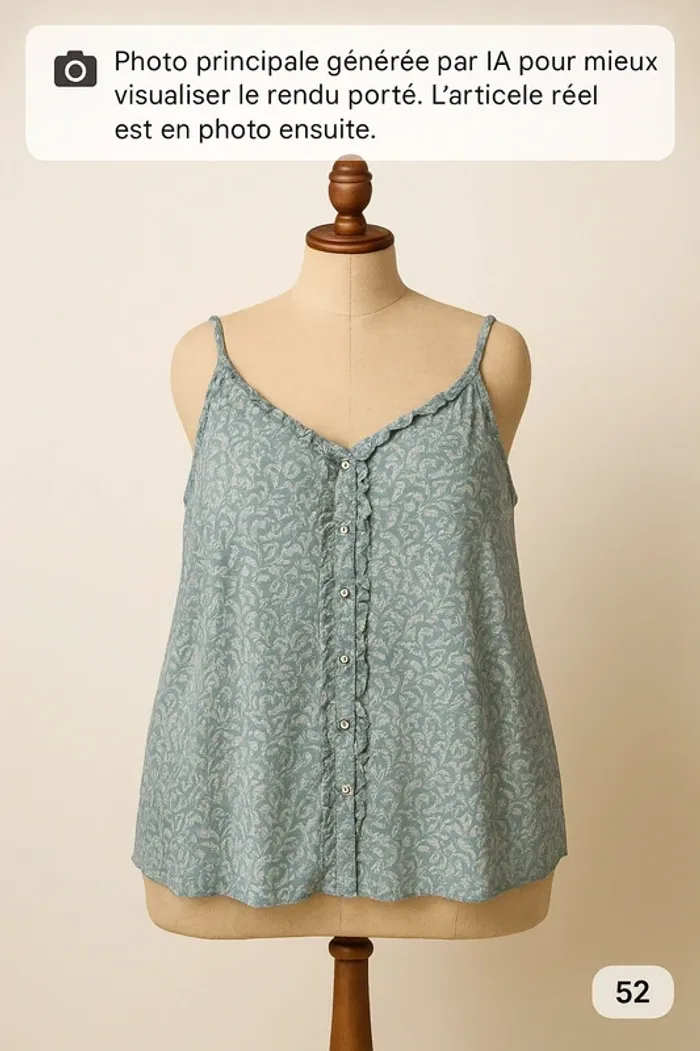 📸 Photo principale générée par IA pour mieux visualiser le rendu porté. ⚠️ Le modèle réel peut légèrement différer. Merci de bien consulter les photos suivantes pour voir l’article réel. Vend Chemisier sans manches fluide, très bon état. Longueur milieu dos 45cm Largeur d'aisselle à aisselle 68cm PAS D'ENVOI VINTED GO! #plussize #grandetaille #blousefemme52 #chemisefemme52 #chemisiersansmanches52 #kiabifemme52 #femme52 #laboutiquedekatmin52