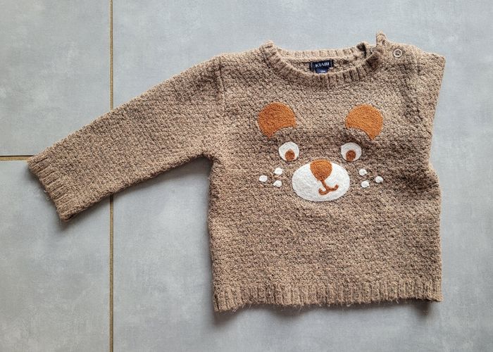 Pull effet laine, de couleur marron avec motif, de la marque Kiabi, taille 12 mois (73-76 cm), en très bon état. Article lavé pour la vente.