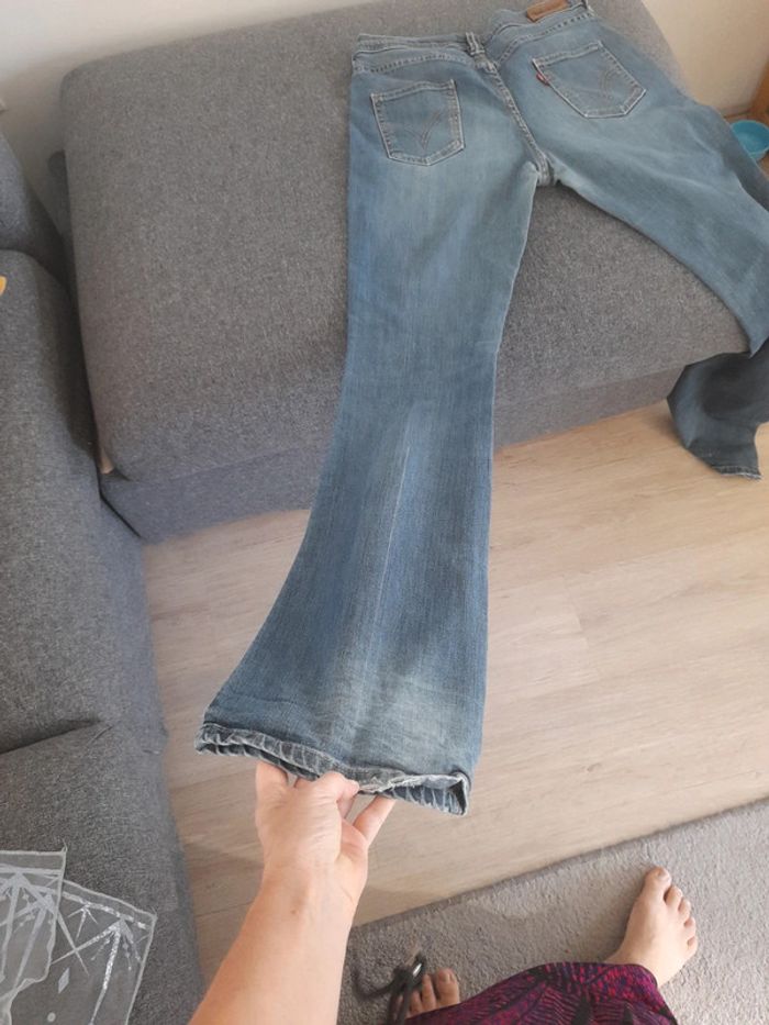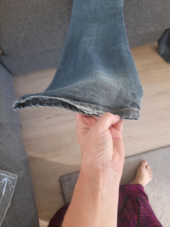 Porté je le vend car trop petit. Légère usure à l entrejambe, bas du pantalon abîmé. Le délavé est d origine. Serre à la taille et en haut du jean la coupe est évasée évasée bas du pantalon. #38vetementfemmecali91300