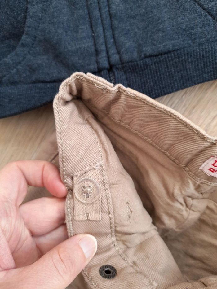 Ensemble composé de: - un jean beige, taille réglable état impeccable peu porté -un gilet à zip intérieur molleton très bon état - un tee shirt manches longues, bon état, il a été un peu plus porte et le dessin est légèrement abîmé mais sans tache ni trou. Le tout en 6 mois 68 cm #6moisgarconcali91300