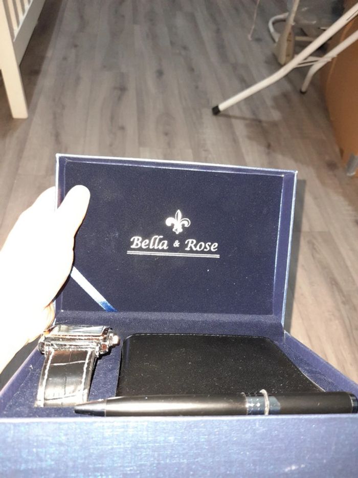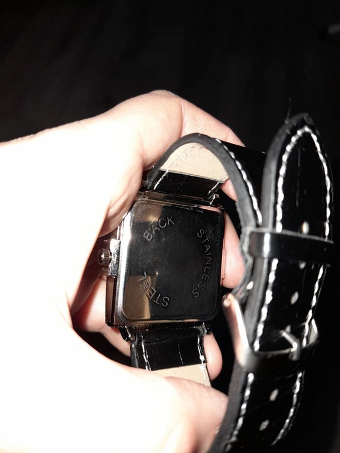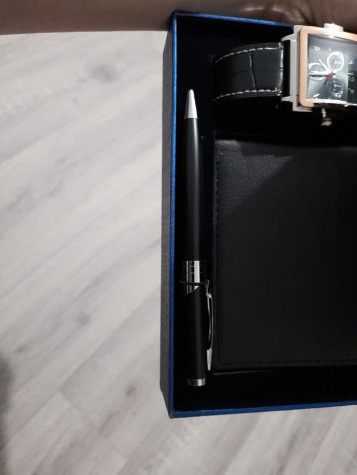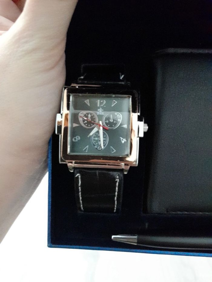 Neuf. Jamais sorti de l emballage. Comprend une montre forme carré piles à changer, stylo et porte carrés