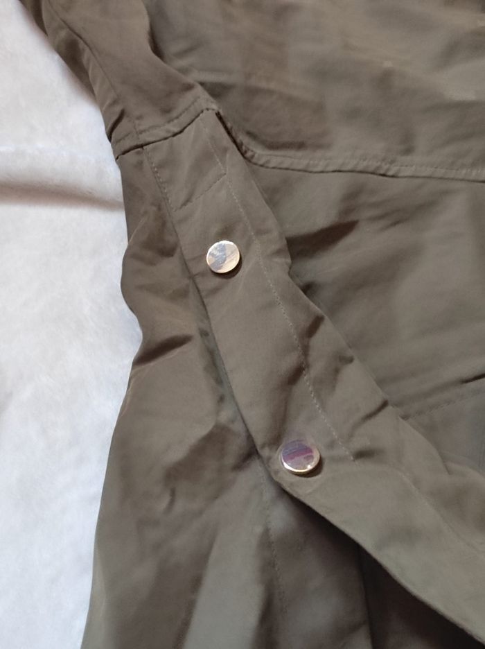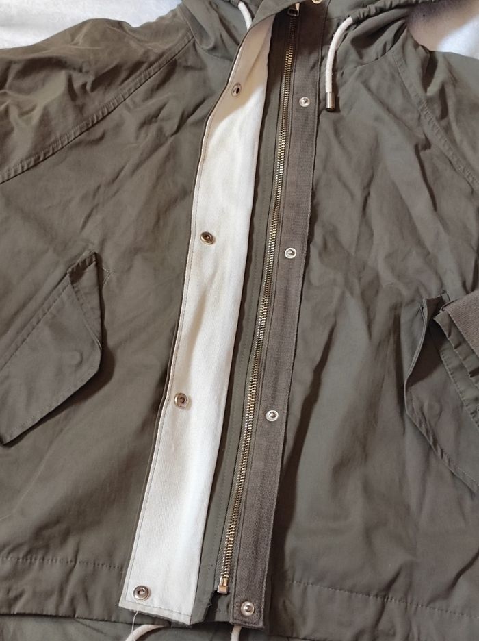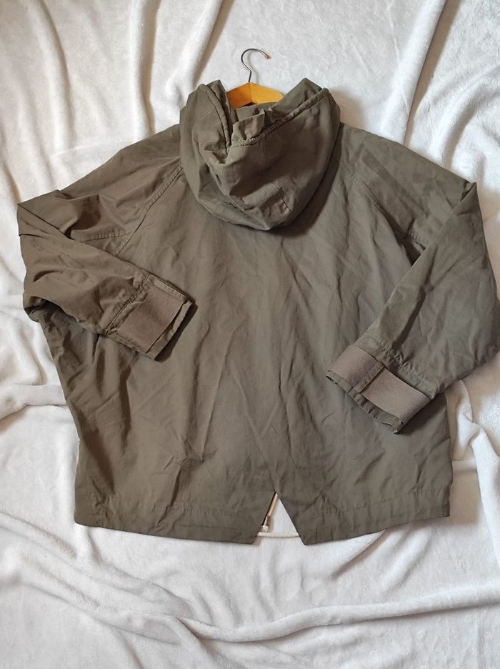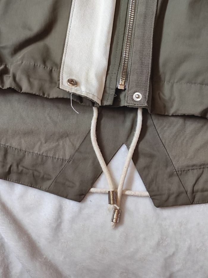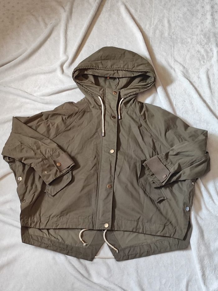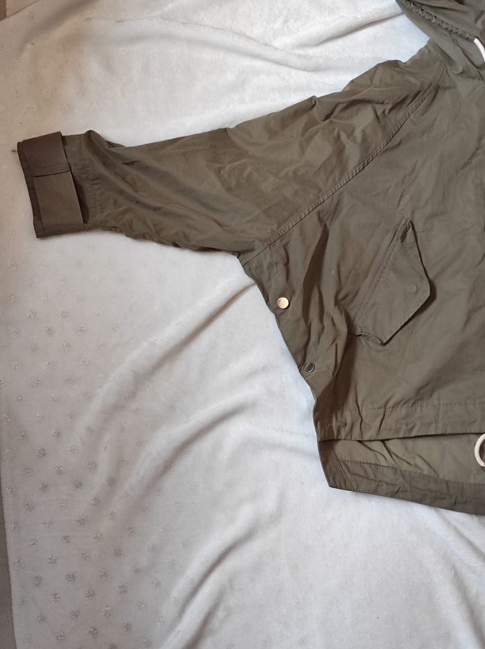 veste mi saison de couleur kaki. Double fermeture ( éclair et boutons ) capuche et poches. Cordon de serrage a la taille qui est oversize et a deux boutons a pression sur le côté, ainsi qu'à la capuche. Léger et agréable à porter. Marque zara en taille S. En parfait état