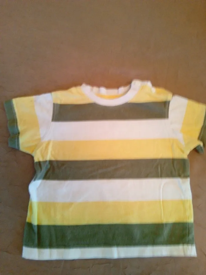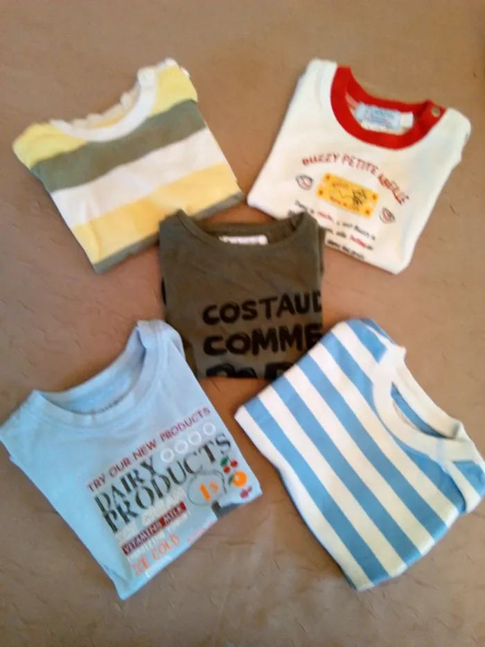 Lot de 5 t-shirts manches courtes Taille 12 mois En bon état juste le rayé jaune qui a une toute petite tâche sur la manche (photo 7) ⚠️Envoi uniquement par mondial relais ⚠️
