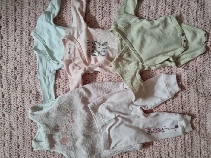 Lot de 3 bodies : gemo kiabi TeX taille 0 naissance 50cm Legging p'tit bisou et salopette taille 1 mois