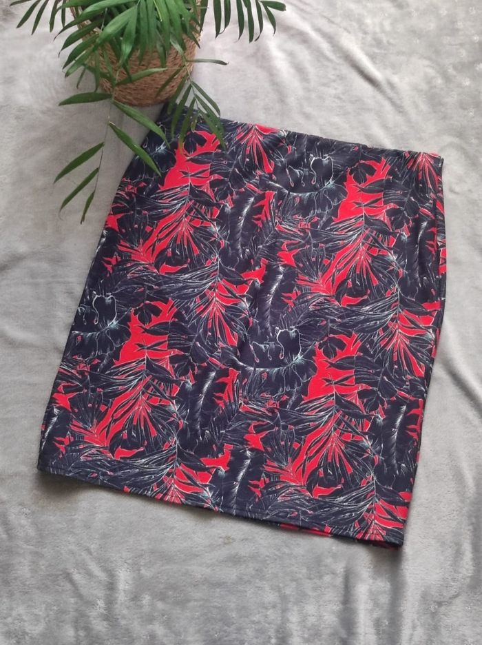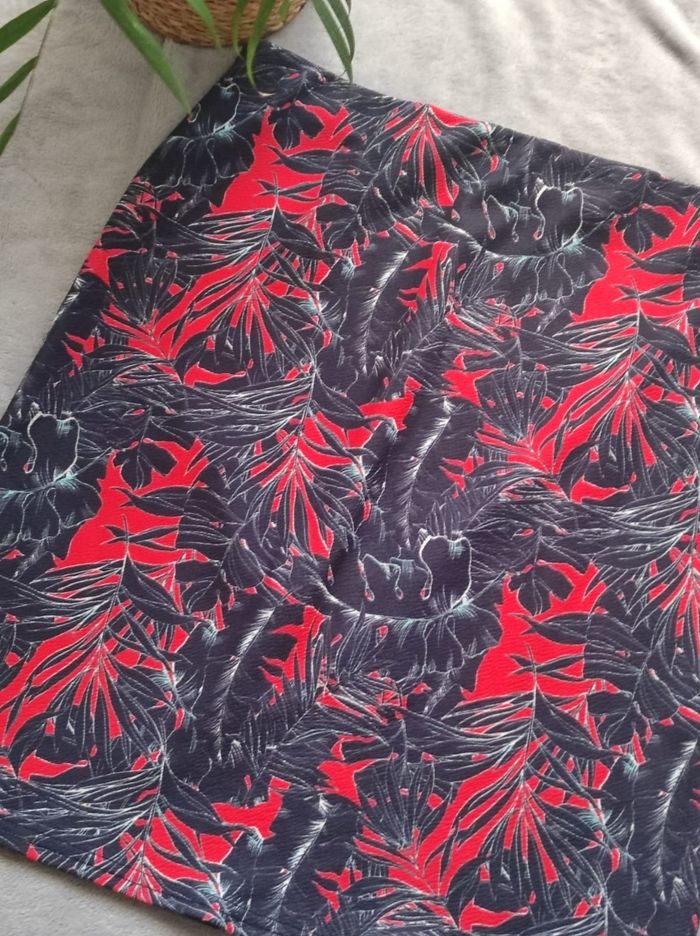 Jolie jupe à motifs floraux sur tons rouge & noire. Élastique à la taille, la matière est elasthanne , s'adapte facilement à la morphologie. Dimensions Tour de taille: 41cm Largeur du bas: 52cm Hauteur : 56cm.