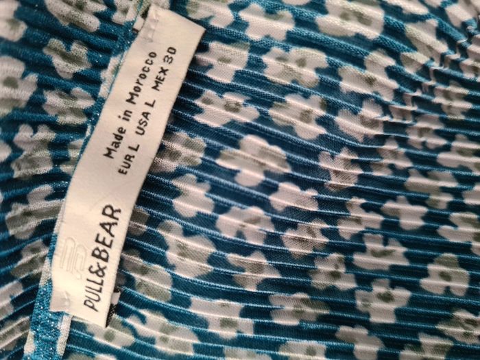 L Largeur sous aisselles 48 cms Hauteur 78 Effet plissé bleu Polyester Très bon état