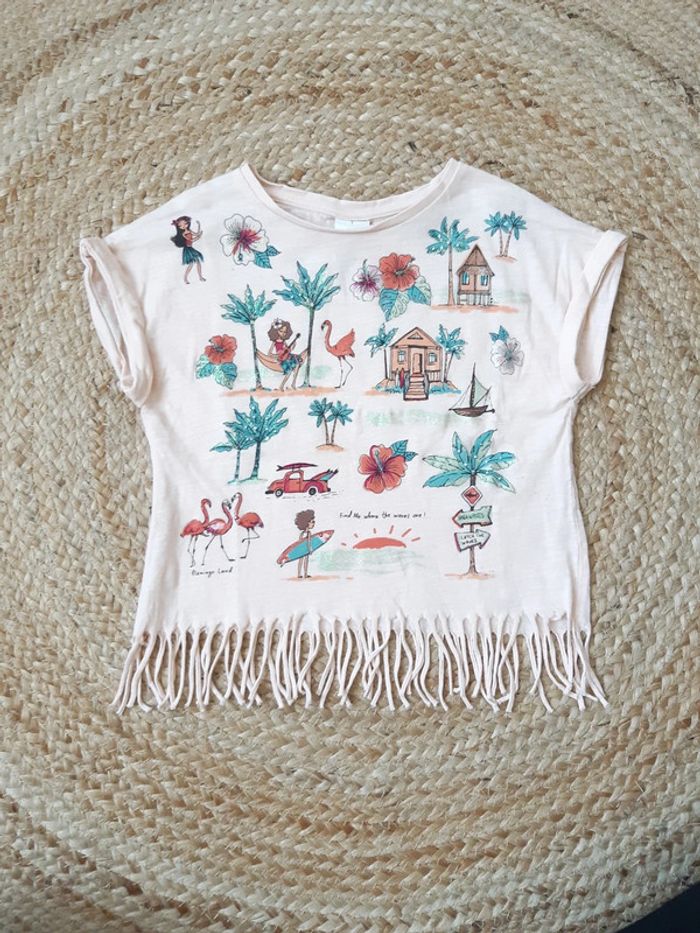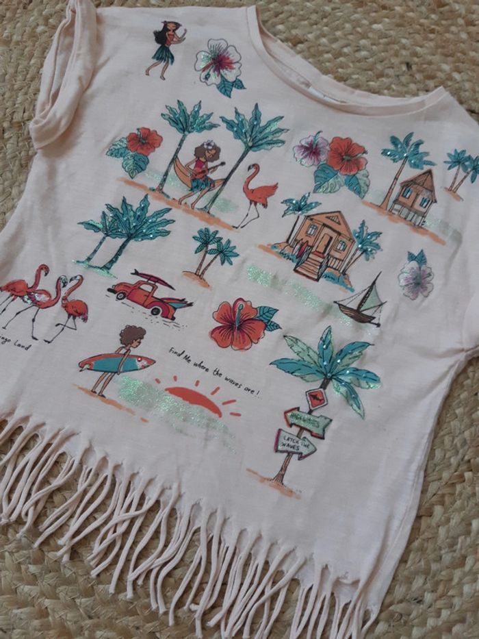 Tshirt Franges Motif fleurs hawaïennes, palmier, bateau... Petites tâches voir photo #anthonyagnes_fille5A