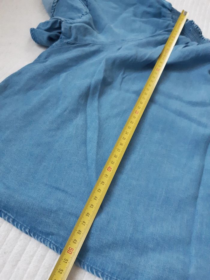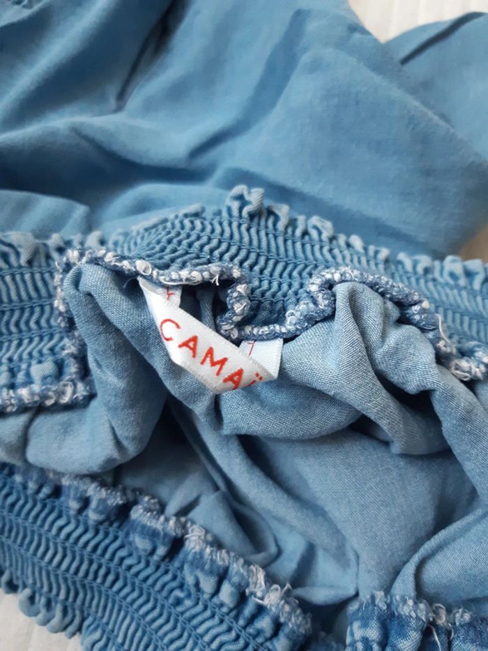 Blouse bleue effet jean Col élastique, possibilité de mettre en épaules dénudées Manches courtes avec volants Etiquette de matière et taille coupées mais correspond à un M/38 #anthonyagnes_femme38