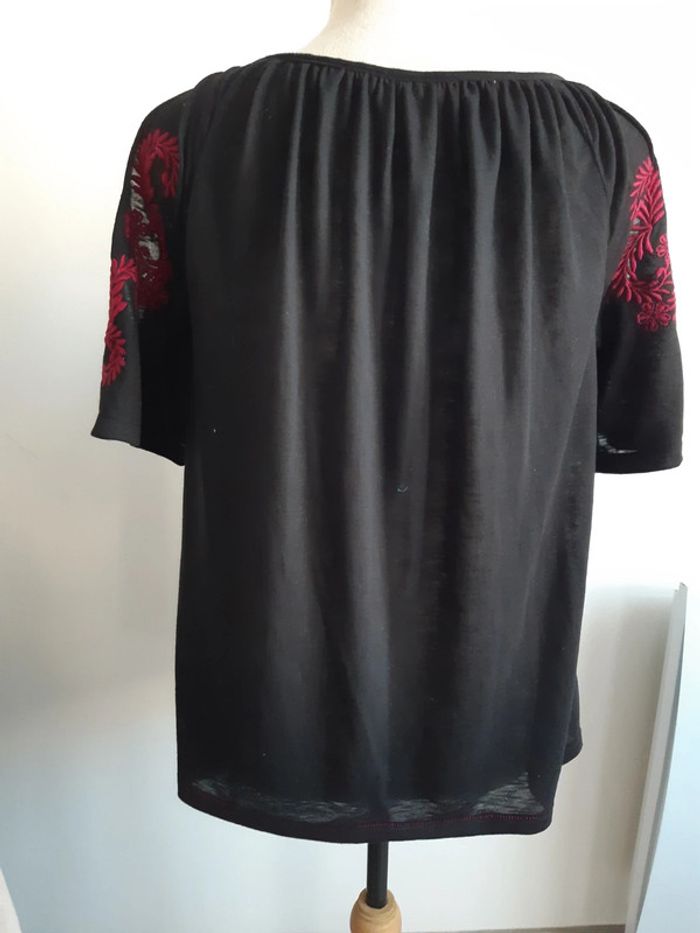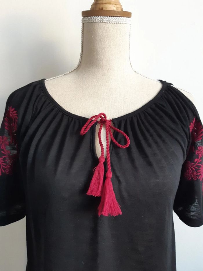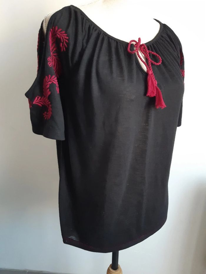 Haut épaules découvertes Avec broderie fleurs sur les manches Manches courtes Pompons Etiquette de matière coupée Taille M/38 #anthonyagnes_femme38