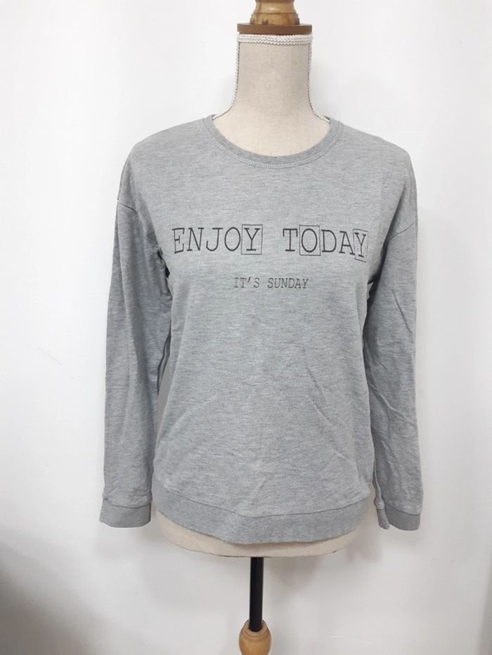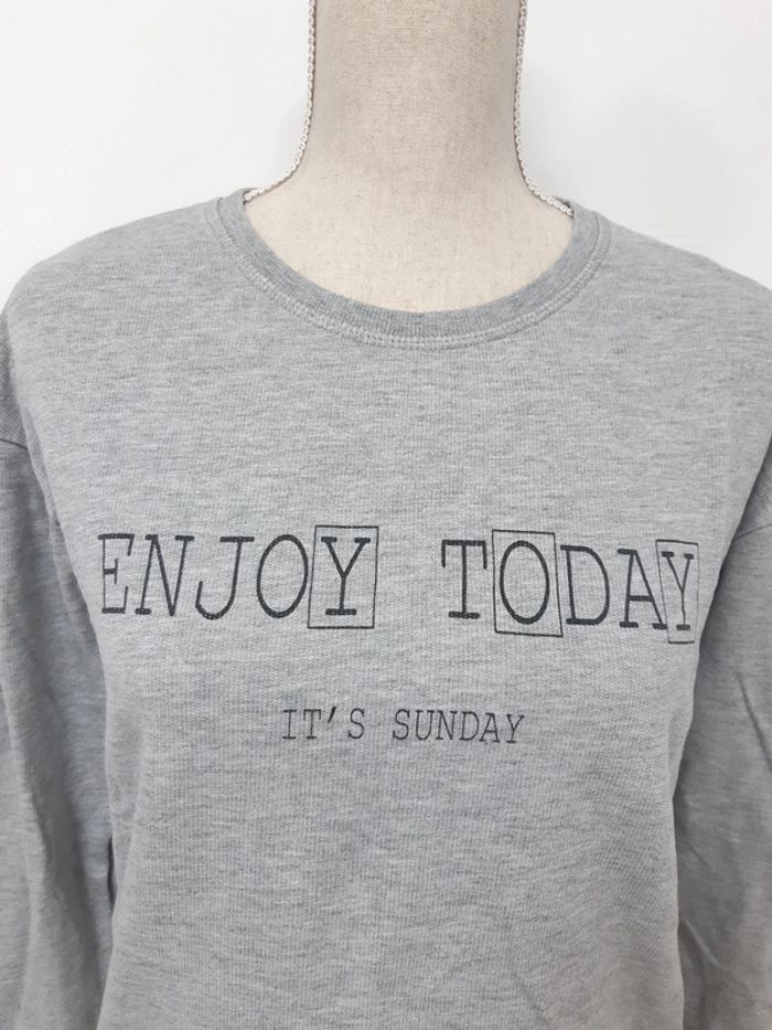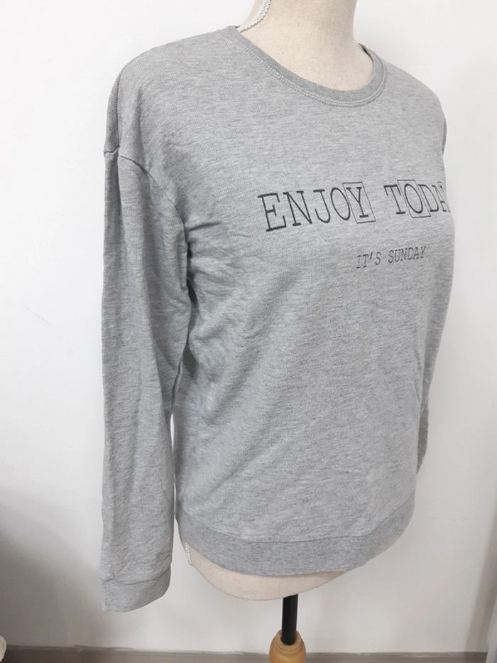 Pull gris avec inscription "enjoy today it's sunday" Etiquette de matière coupée #anthonyagnes_femme38