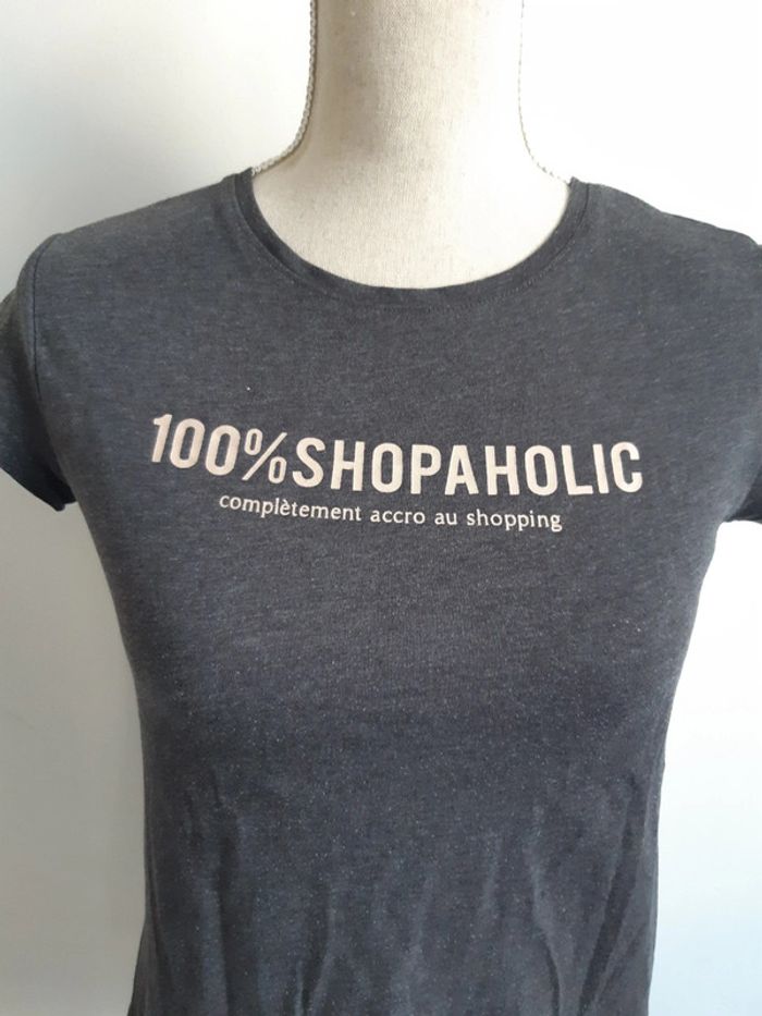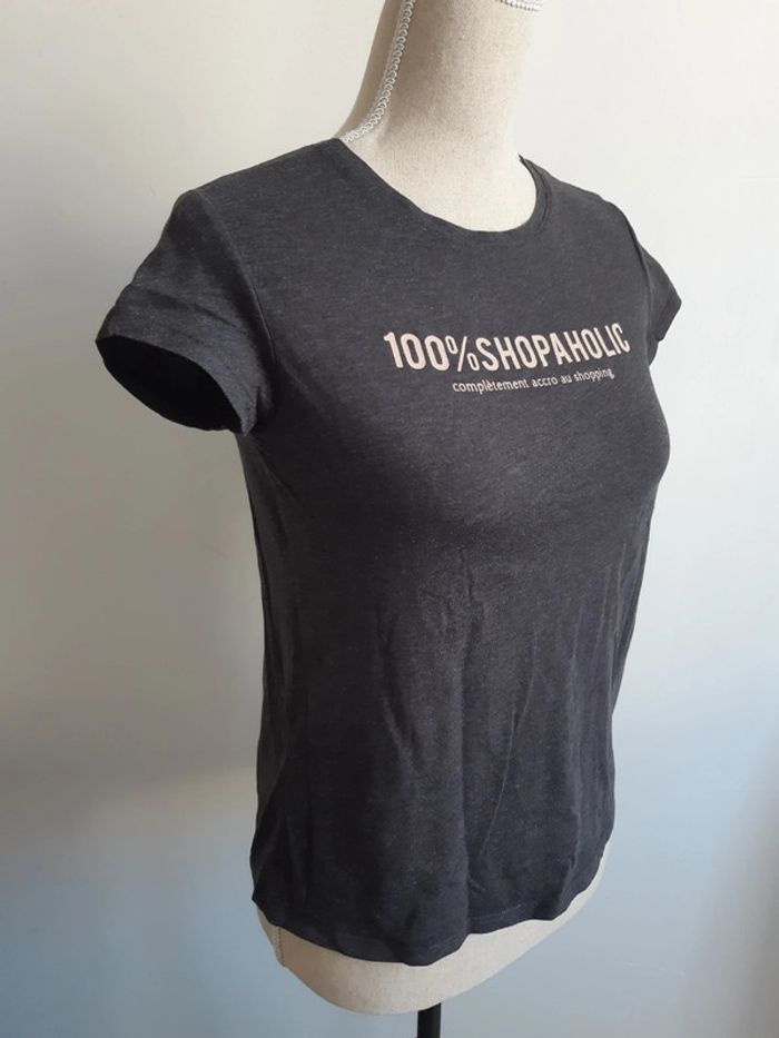 Tee shirt gris Inscription "100% Shopaholic complètement accro au shopping" Kiabi Taille XS/34 #anthonyagnes_femme34
