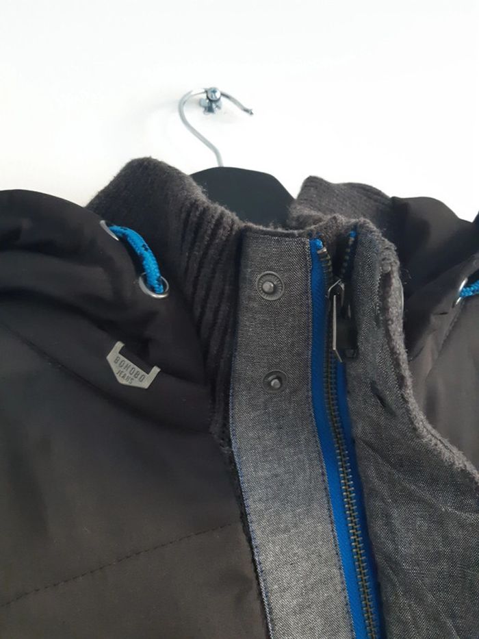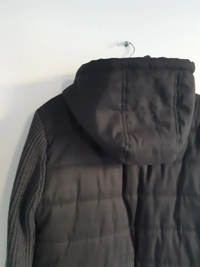 Manteau à capuche Bi matière, en maille et effet matelassé/doudoune dans le dos et la capuche Maille côtelé aux manches et au col Poches extérieures latérales et une intérieure Boutonné et zippé Col montant Porté seulement 2 fois Taille M Bonobo #anthonyagnes_homme