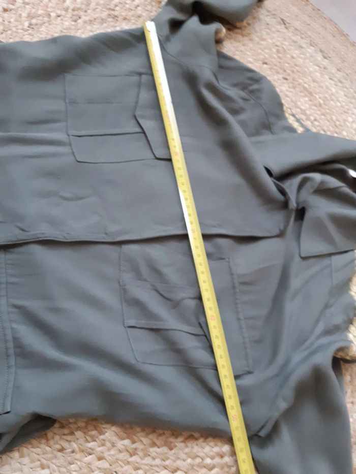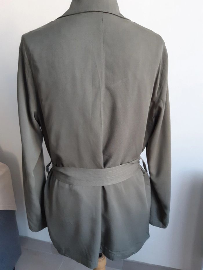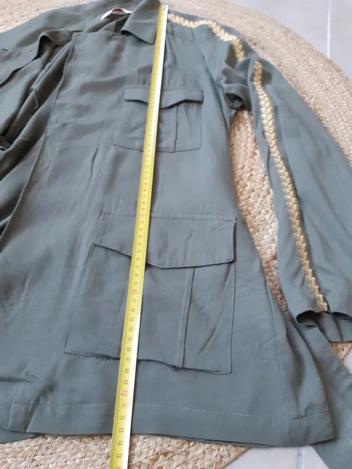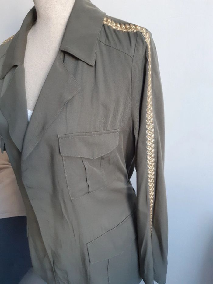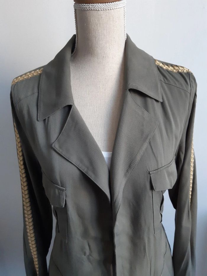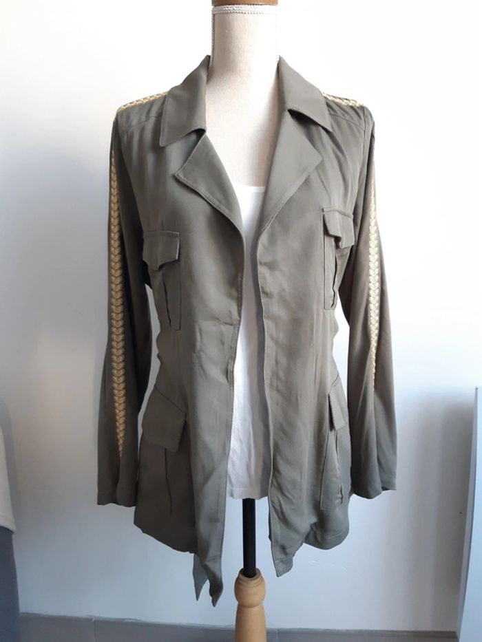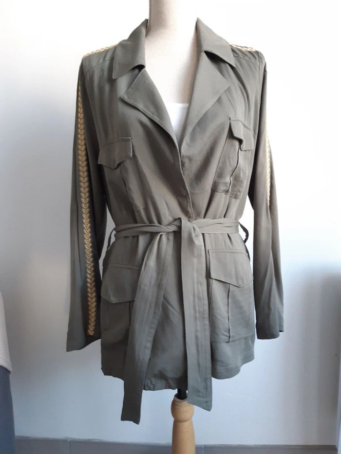 Veste kaki avec poches Fine et légère Motif doré et brodé le long des manches Avec ruban ceinture à nouer Etiquette coupée mais taille M/38 #anthonyagnes_femme38 #vêtement #femme #veste #blazer #militaire #kaki