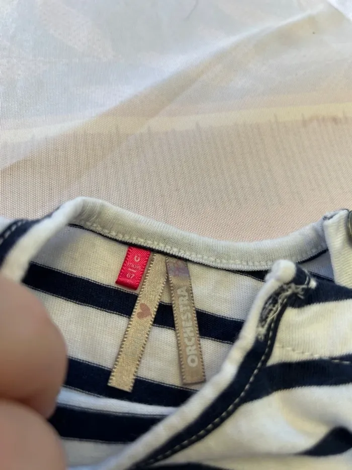 Teeshirt marin Orchestra, petits boutons col côté gauche Bébé garçon ou fille Taille - 6 mois Mis 2 fois, excellent état, comme neuf Prix d’achat : 6,90€ 🌸 maison non fumeur 🌸