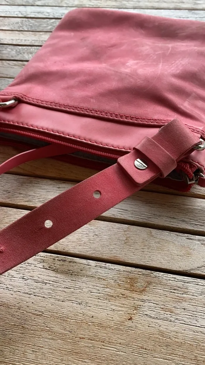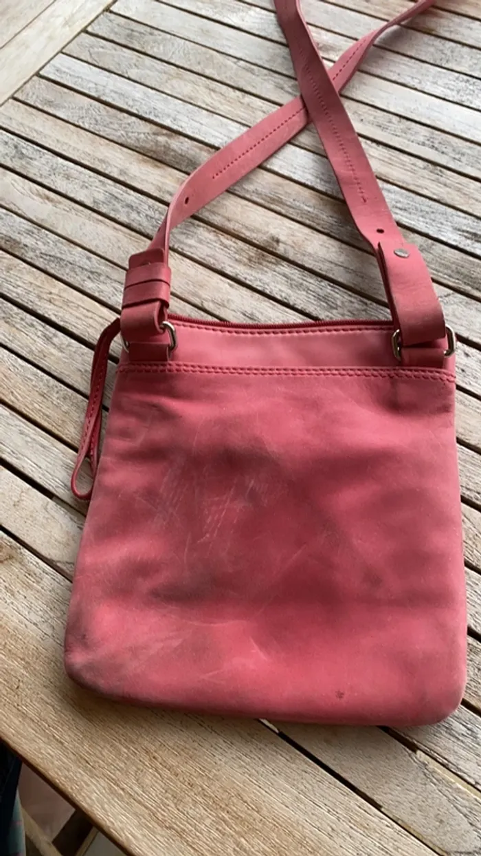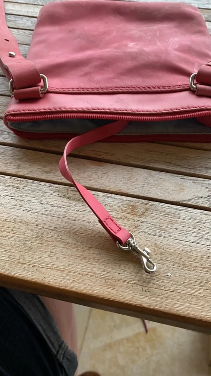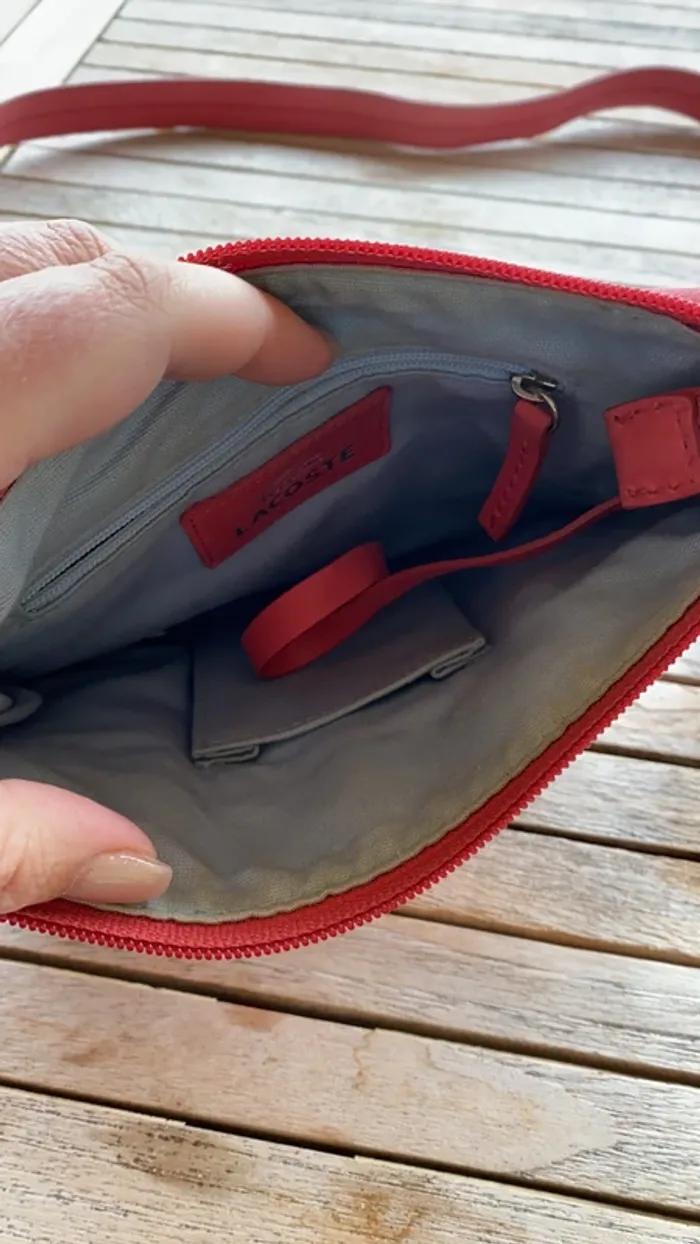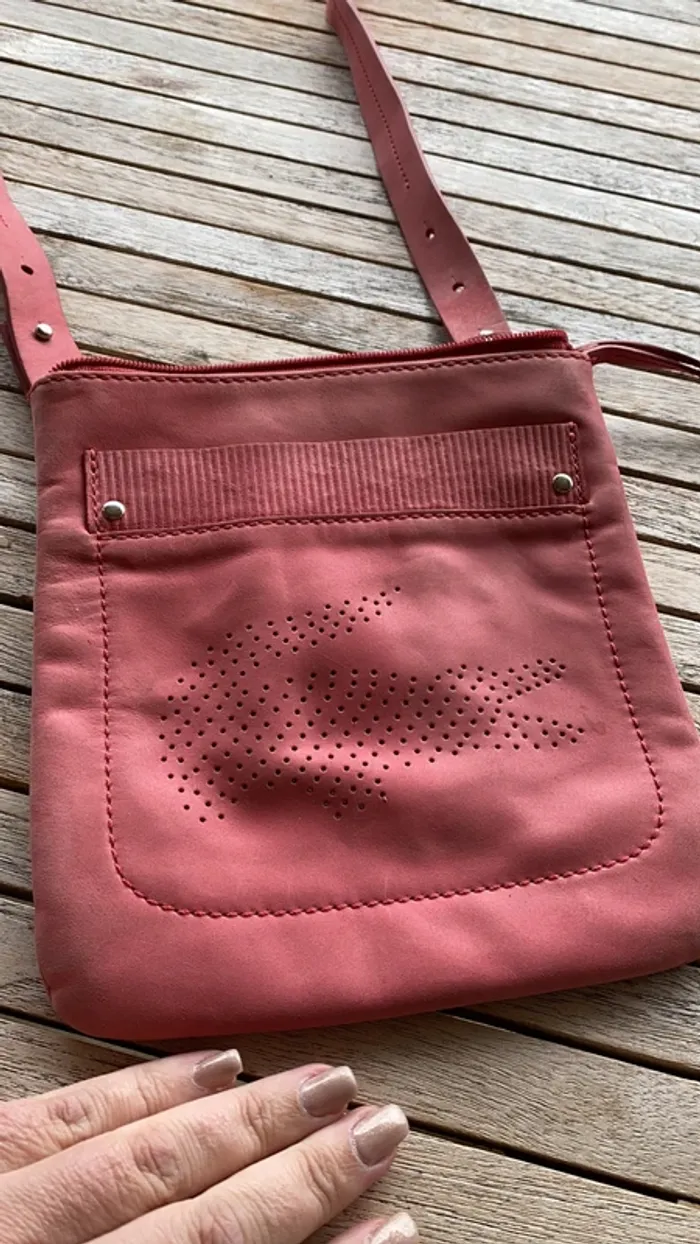 Sacoche Lacoste rose portée en bandoulière 21x20cm bandoulière réglable petit tache devant et sortes de griffures sur le verso (voir photos)