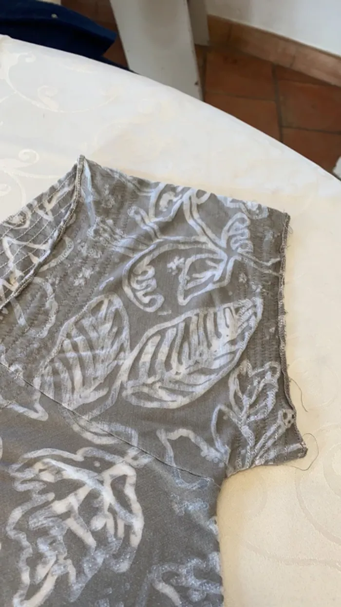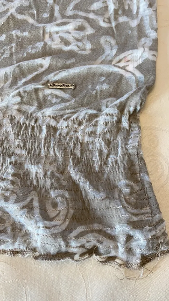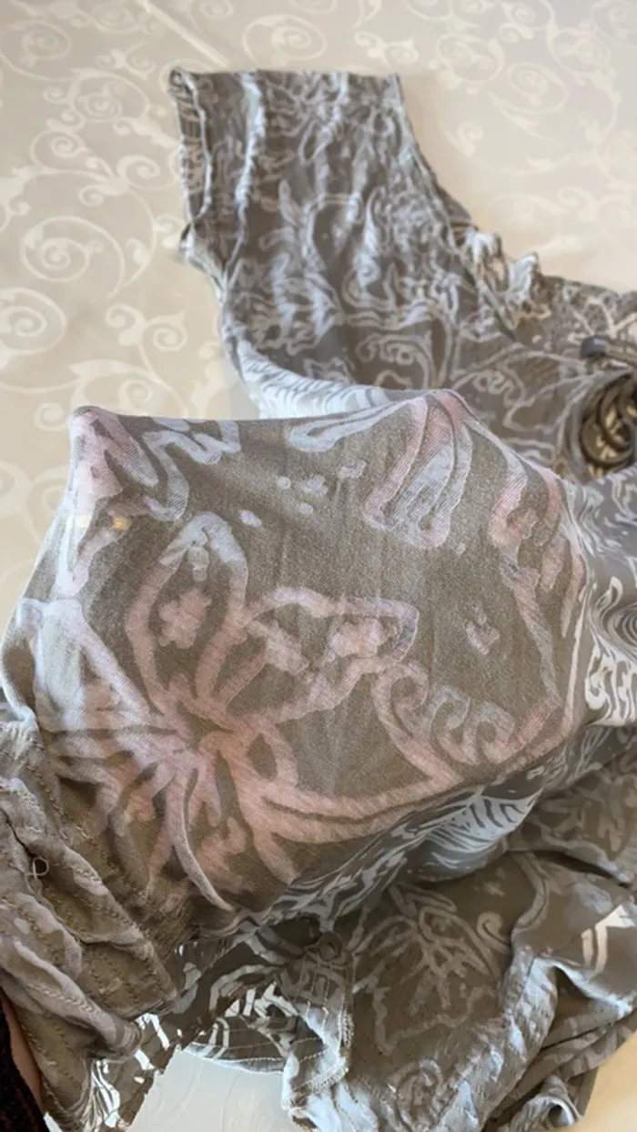 Top gris type voilage Banana Moon Un peu transparent Taille XL mais taille très grand (doc jamais porté) Col avant fête par petit lacet les smokes des bras et du bas sont un peu détendus