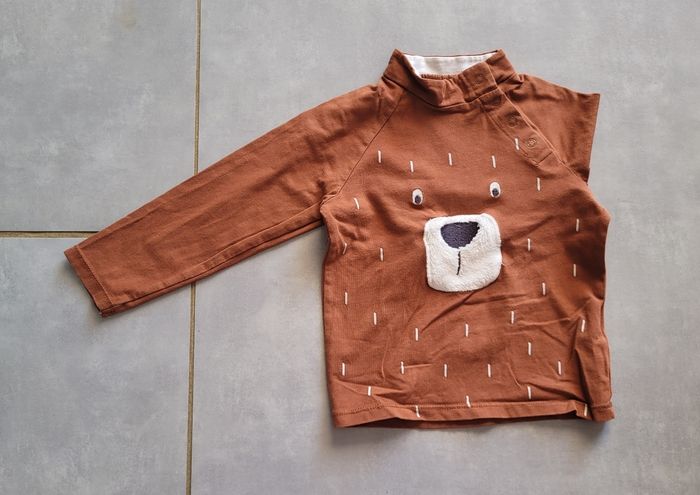 T-shirt manches longues, de couleur marron avec motif, de la marque Kiabi, taille 18 mois (77-82 cm), en très bon état. Article lavé pour la vente.