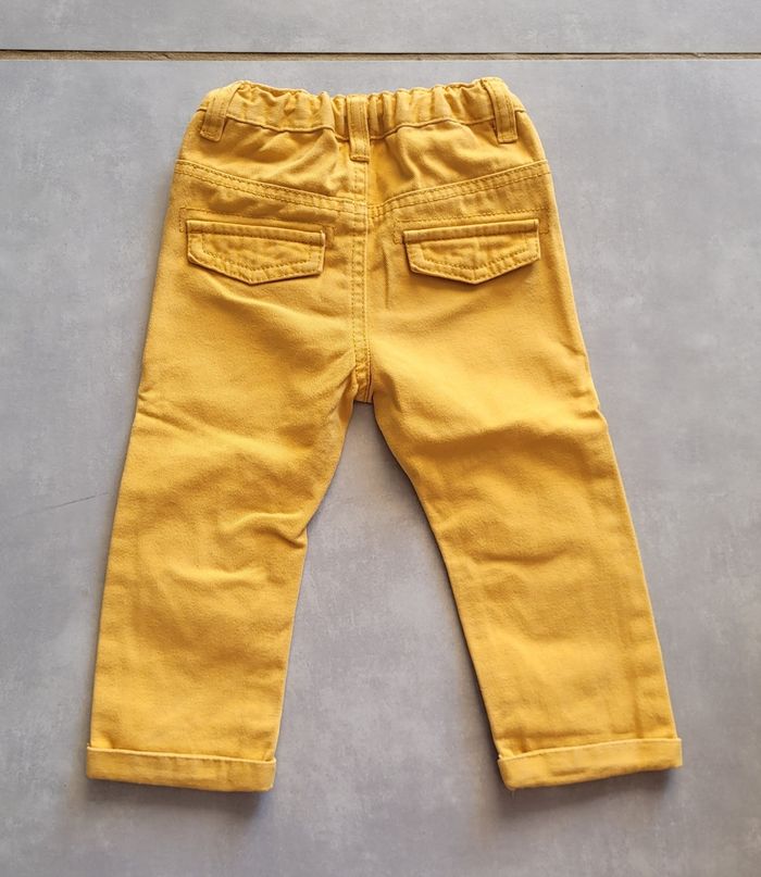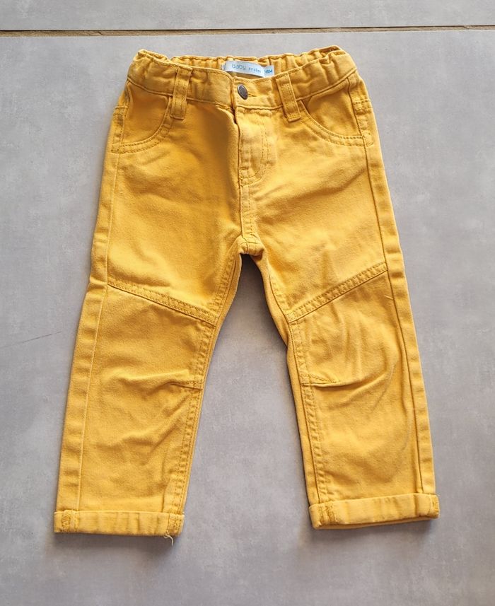 Jean de couleur moutarde, de la marque Gémo, taille 18 mois, en très bon état. Article lavé pour la vente.