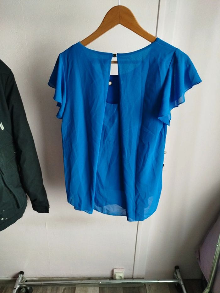 Petit haut bleu , débardeur avec voilage par dessus , je n'est plus le collier. Taille unique .