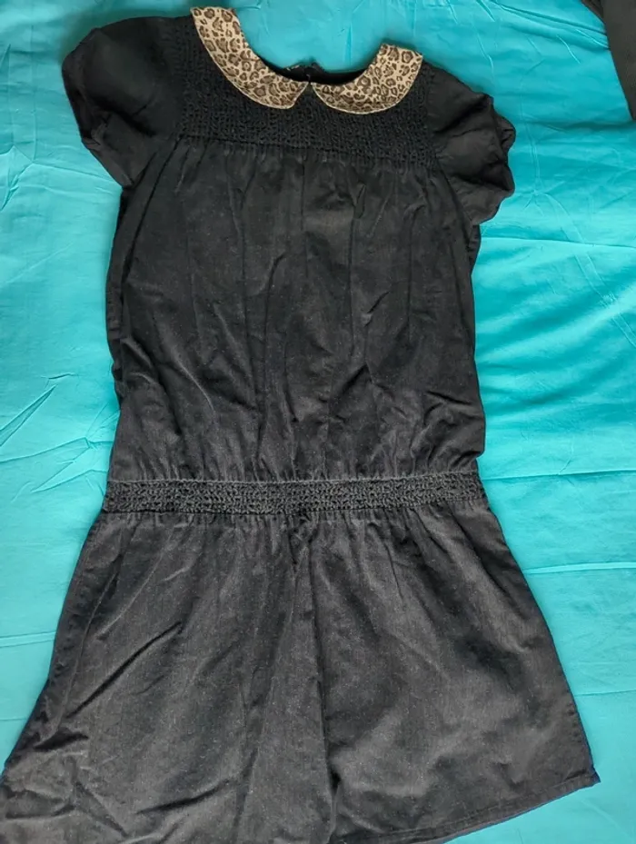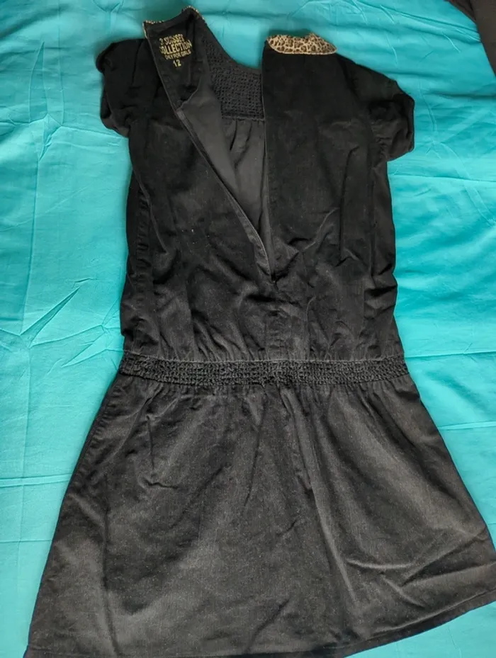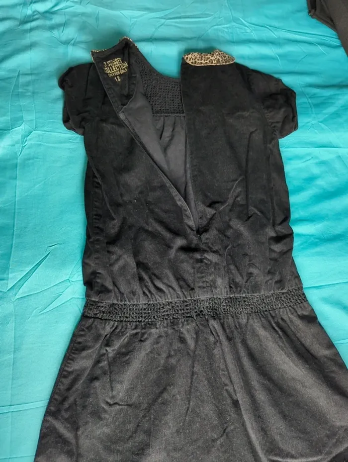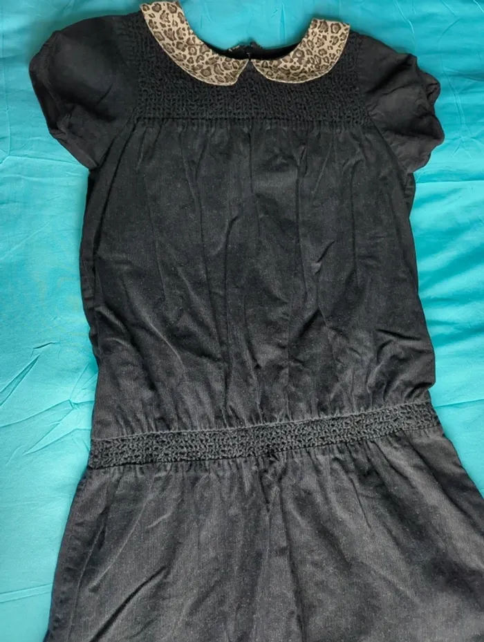 Robe noire en velours léger, manches courtes, col claudine léopard, fermeture à glissière au dos, fille 12 ans, longueur 77cm, portée plusieurs fois, très bon état, marque 3 suisses .