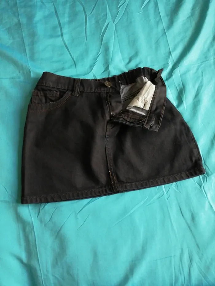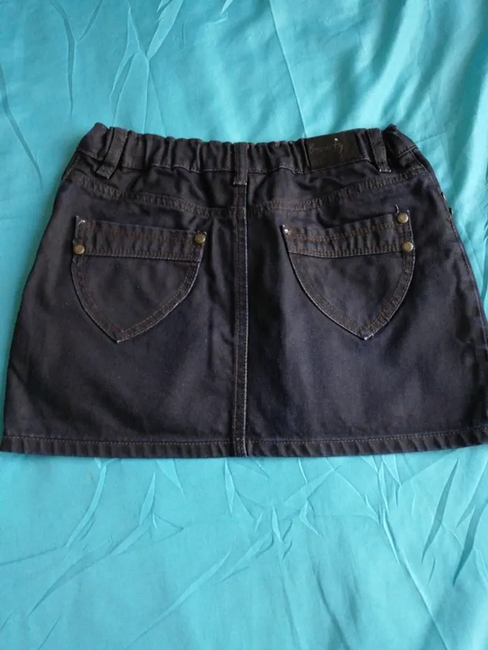 Jupe en jeans, bleu marine, droite, courte, deux poches devant et arrière, taille ajustable, fermeture à glissière et bouton, fille 12 ans, bon état, il manque juste deux clous aux poches arrières, marque kiabi.