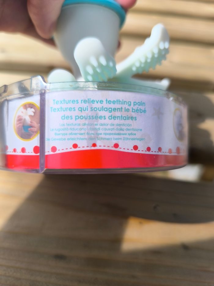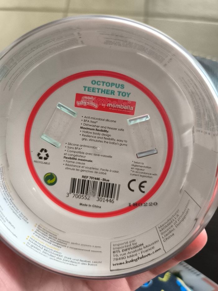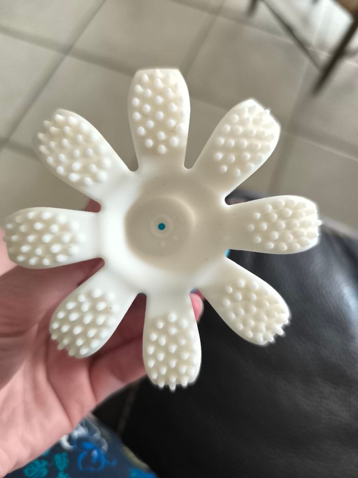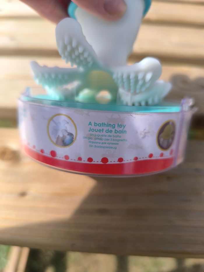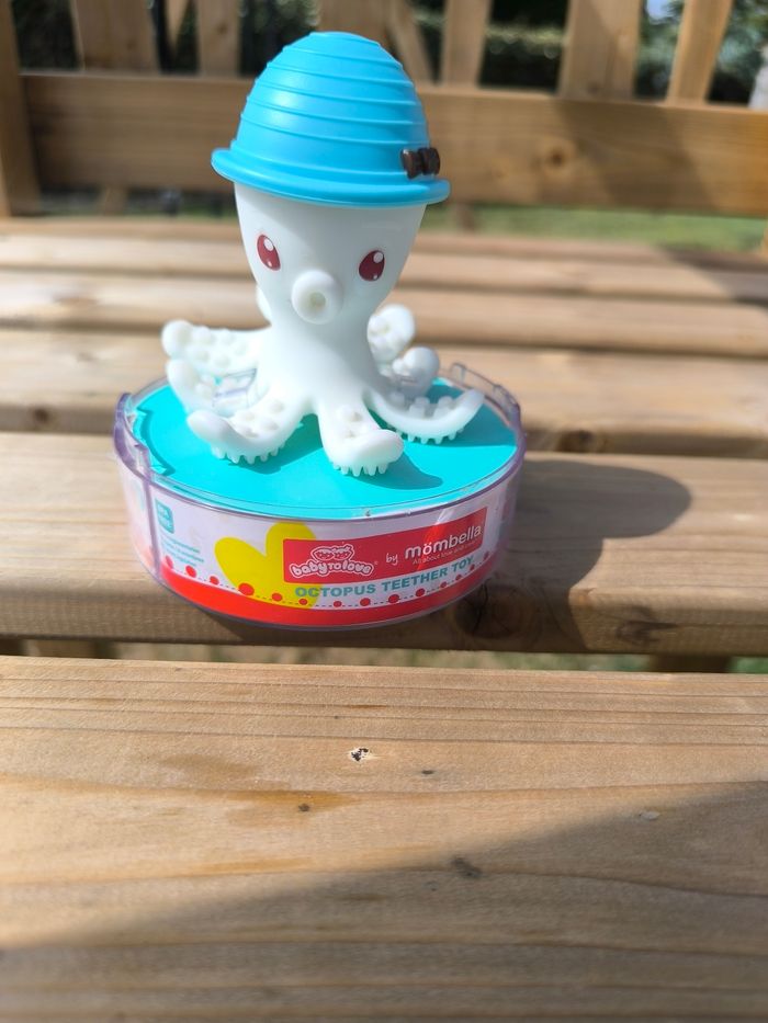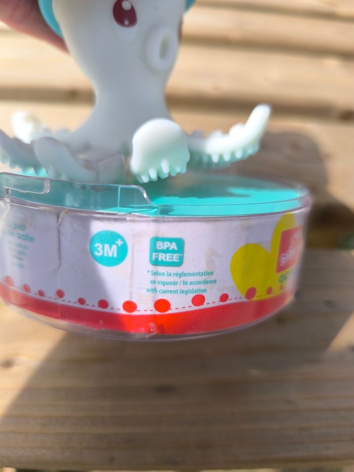Bonnie la pieuvre. Très bon état. Peut-être utilisée. Conseillée par l'orthophoniste pour mon petit pour appréhender sa bouche et mieux prendre ses biberons. Jouet de bain, objet à mâchouiller pour les dents, balle. Vendue sur son socle d'origine. Je ne mets pas la cloche plastique qui va dessus car elle est fendue.