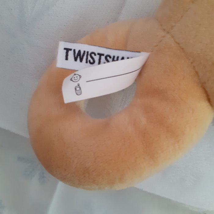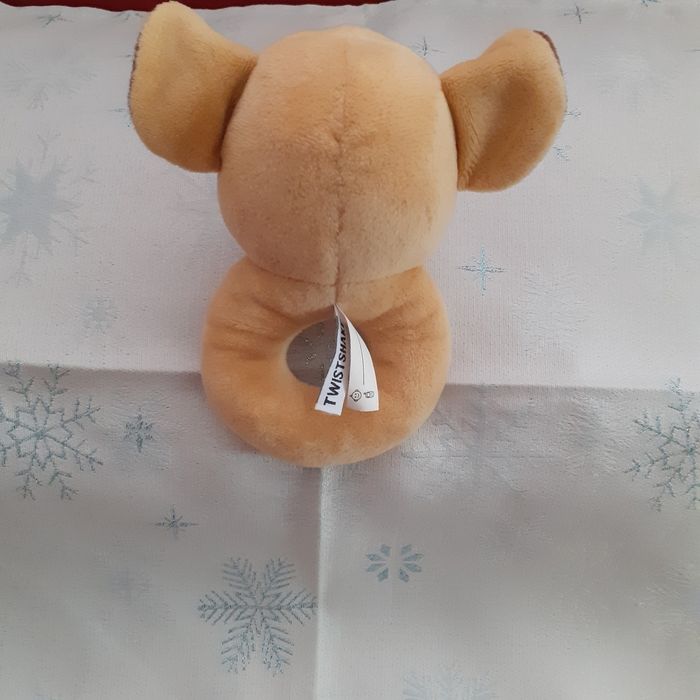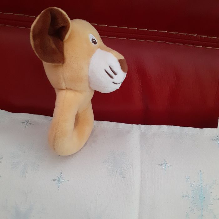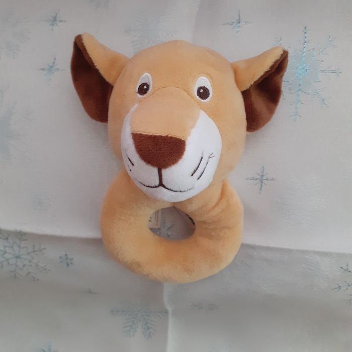 Doudou marque Twistshake. Petit Lion entièrement rembourré; yeux et museau brodés; bruit de grelot quand on le secoue; étiquette pour inscrire le prénom du bébé. Hauteur totale de 15 cm // voir photos pour détails