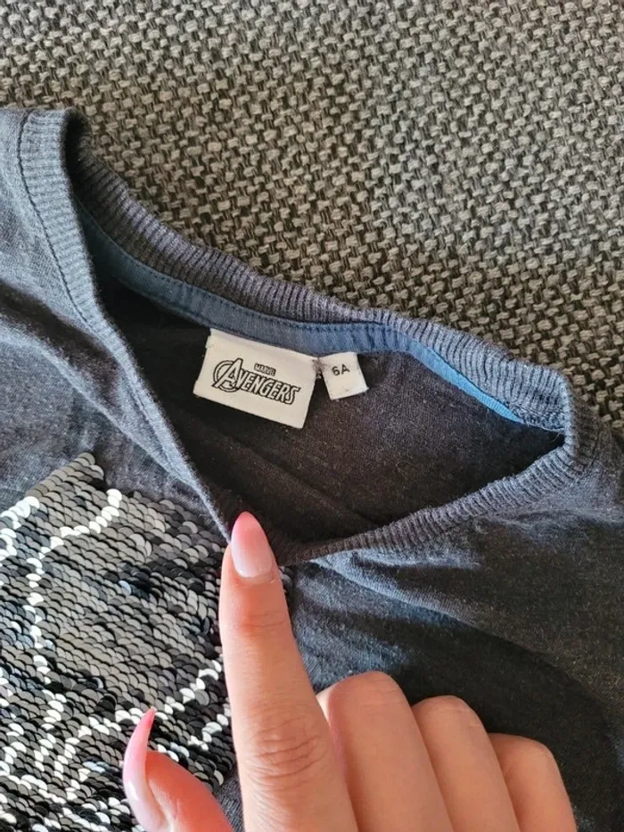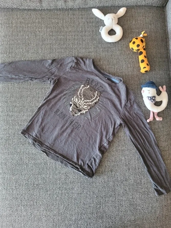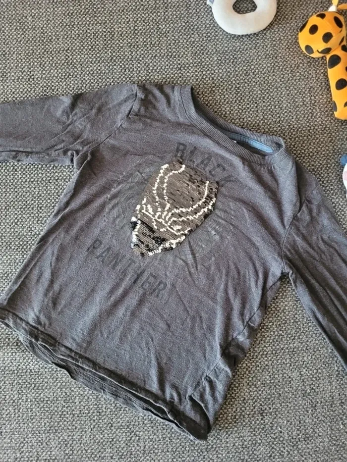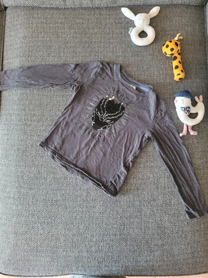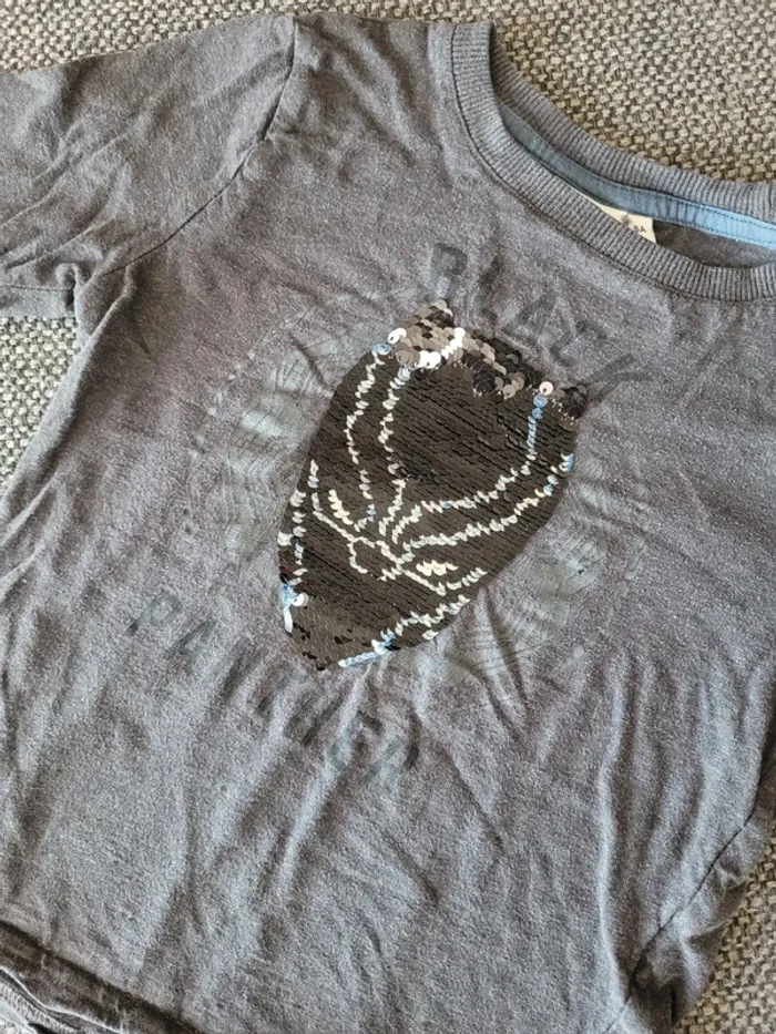 T-shirt à manches longues Black Panther de taille 6 ans Gris anthracite avec tête en sequins réversibles Aucune tâche ni trou. Le tissu a bouloché aux lavages #mabi38780fille6ans #mabi38780mixte6ans