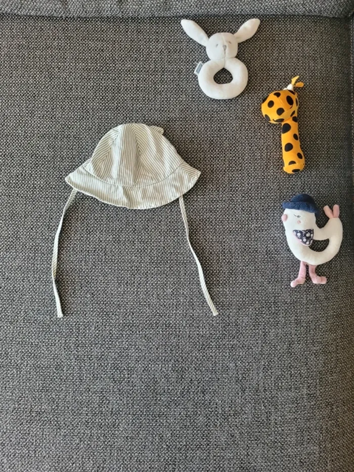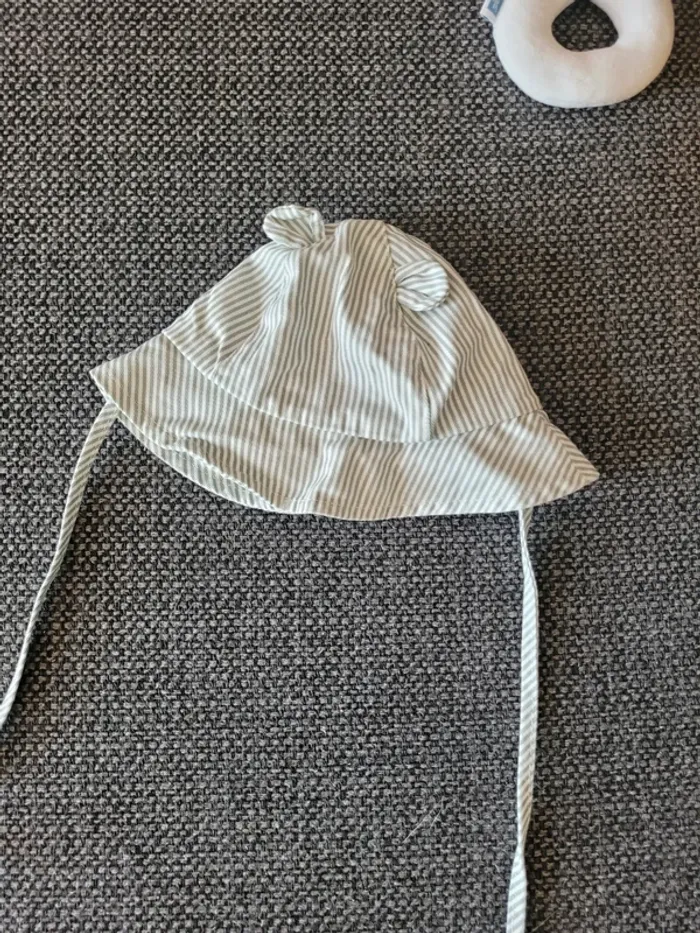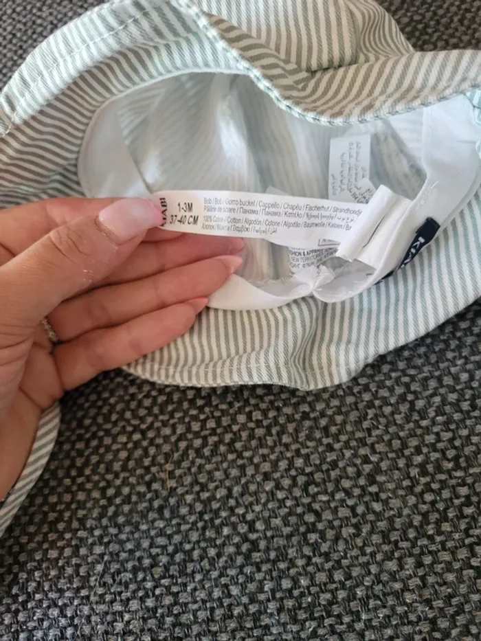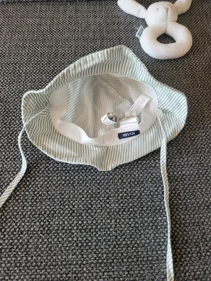 Chapeau pour bébé de la marque Kiabi et de taille 1-3 mois 37-40 cm Blanc à rayures vert sauge avec oreilles en relief 100% coton 2 liens à nouer pour assurer un bon maintien sur la tête Très peu porté donc comme neuf Aucune tâche ni trou #mabi38780accessoires #mabi38780garcon0mois #mabi38780mixte0mois #mabi38780fille0mois #mabi38780garcon1mois #mabi38780mixte1mois #mabi38780fille1mois #mabi38780garcon3mois #mabi38780mixte3mois #mabi38780fille3mois
