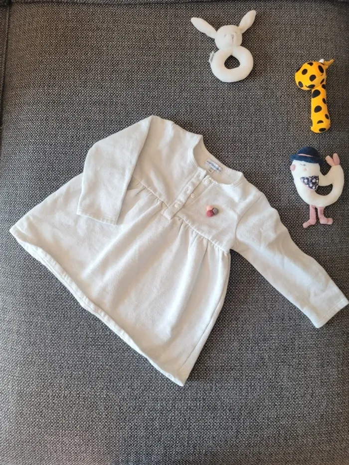 Robe pour fille à manches longues de taille 3 ans et de la marque Vertbaudet Molletonnée donc idéale pour l'hiver Beige avec des fils argentés et 3 pompons brodés Très jolie pour une cérémonie, un anniversaire, un baptême ou les fêtes de fin d'année Attache devant par des boutons Aucune tâche ni trou #mabi38780fille3ans #mabi38780noel
