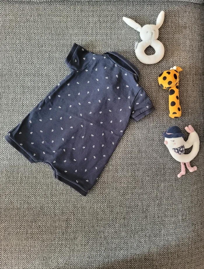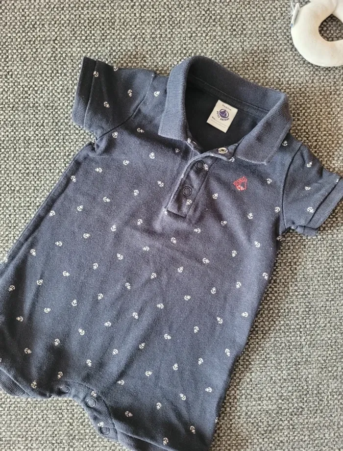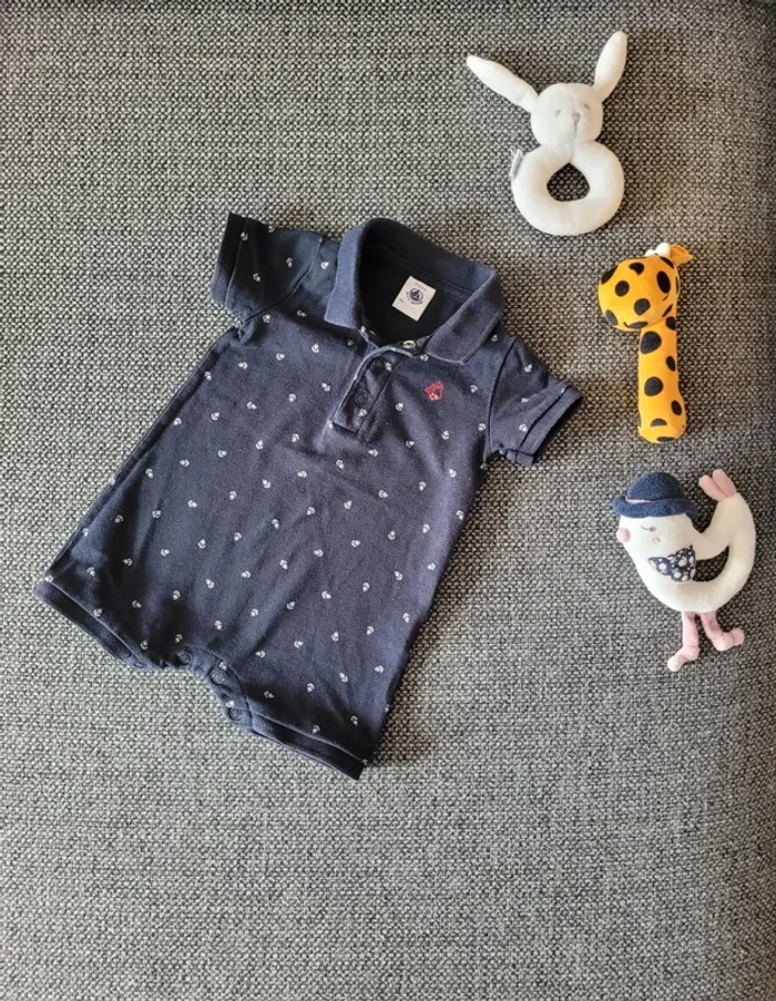 Combinaison short pour bébé garçon de taille 6 mois et de la marque Petit Bateau Couleur bleu marine à motifs ancres blanches Attache par pressions au niveau du col et de l'entrejambe pour faciliter le change En tissu type polo Comme neuve Aucune tâche ni trou #mabi38780garcon6mois
