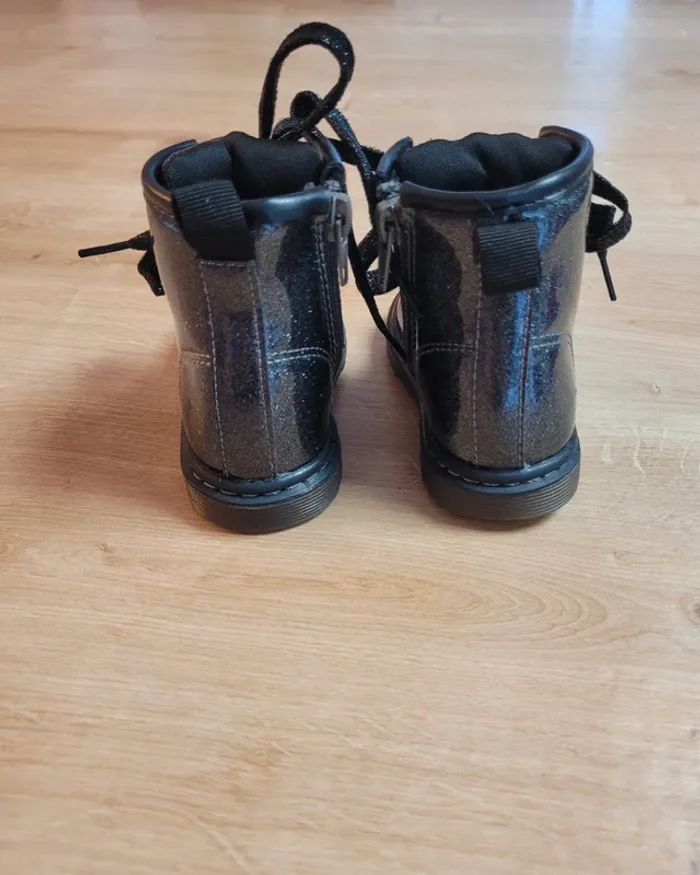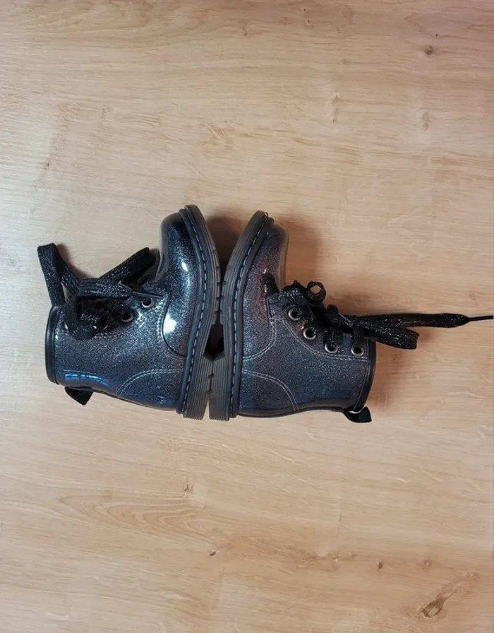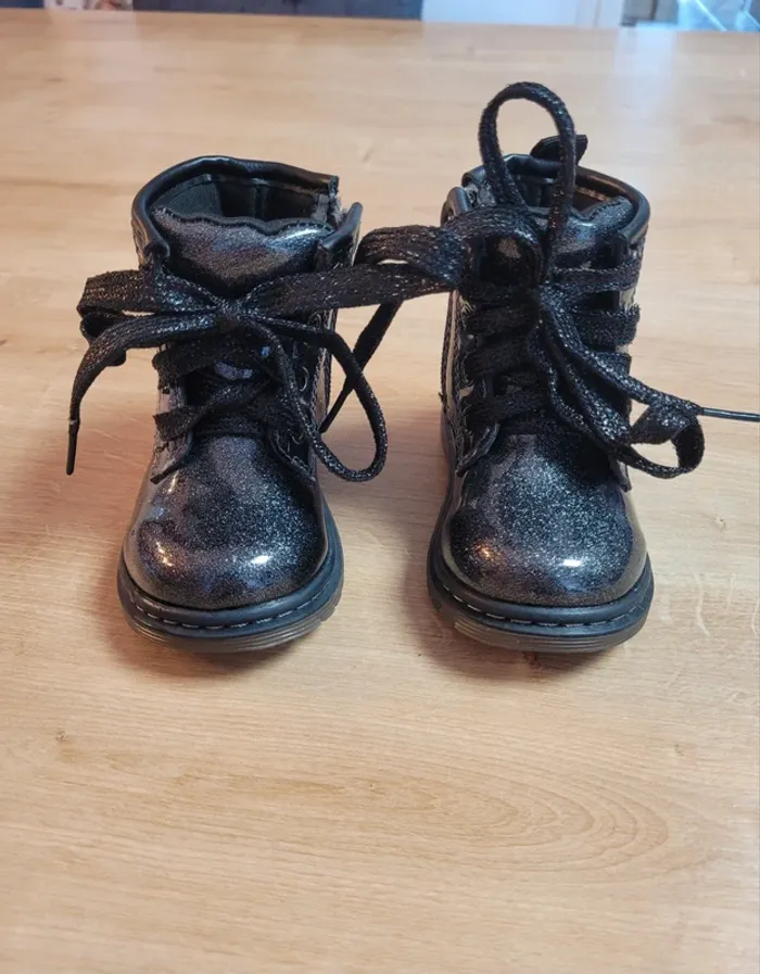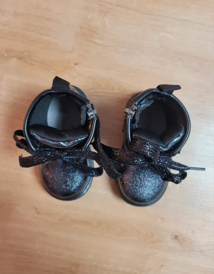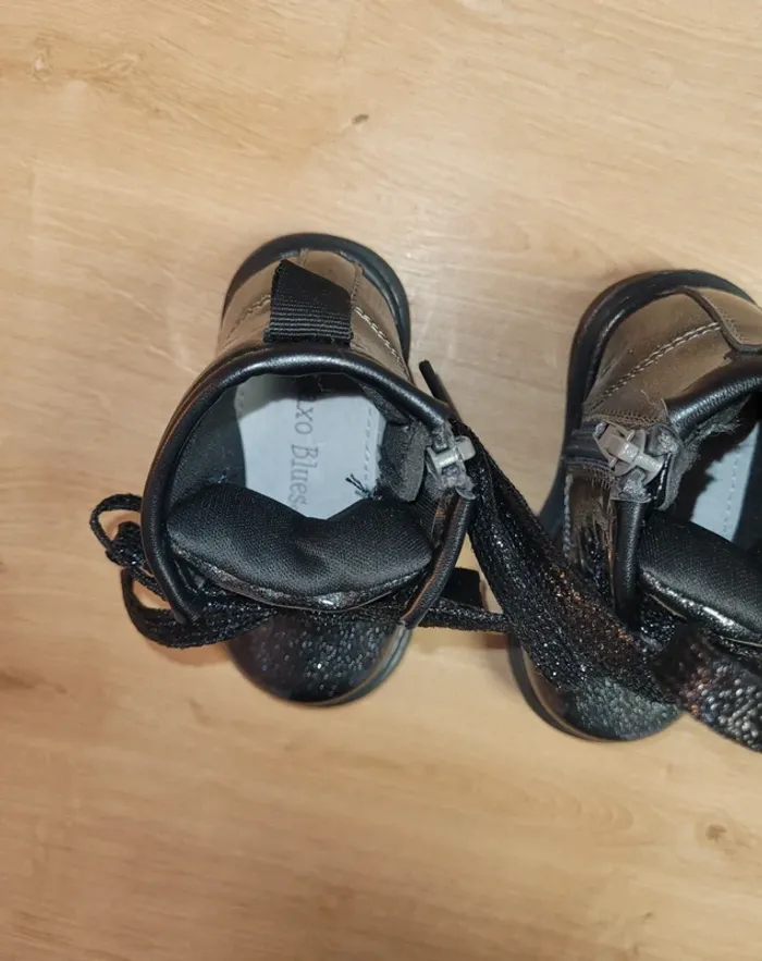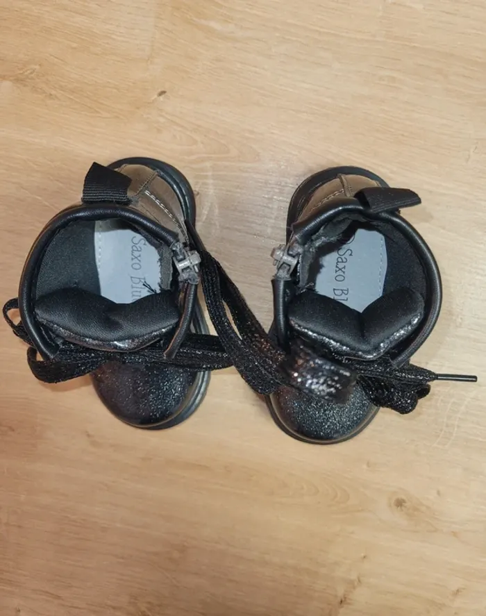 Bottines pour fille de la marque Saxo Blues et de taille 20 Noires vernies à paillettes Fermeture éclair sur le côté intérieur Lacets noirs et argentés Neuves jamais portées #mabi38780fille20