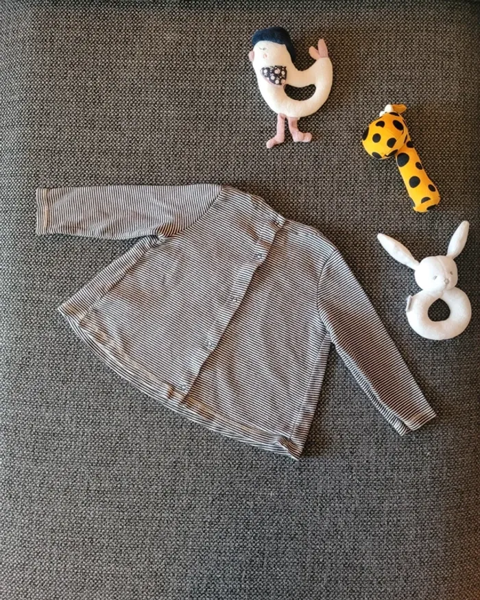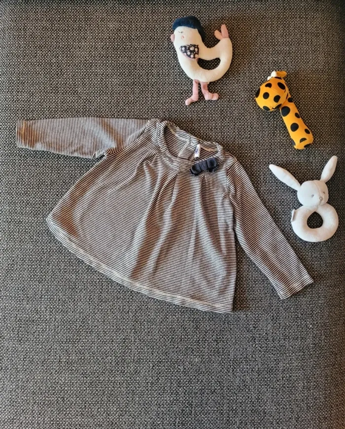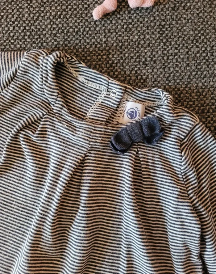 Blouse trapèze pour fille de la marque Petit Bateau et de taille 18 mois A manches longues avec un nœud au col Iconique motif marinière Aucune tâche ni trou. Juste un petit accroc au niveau de la base de la manche droite à l'arrière (voir photos) #mabi38780fille18mois