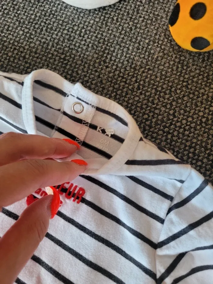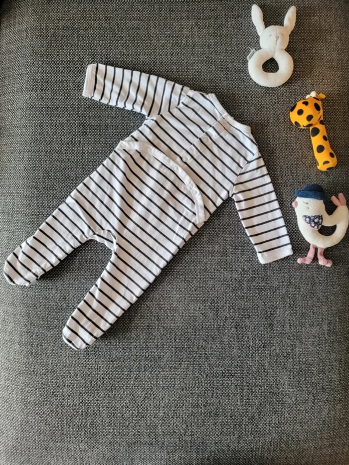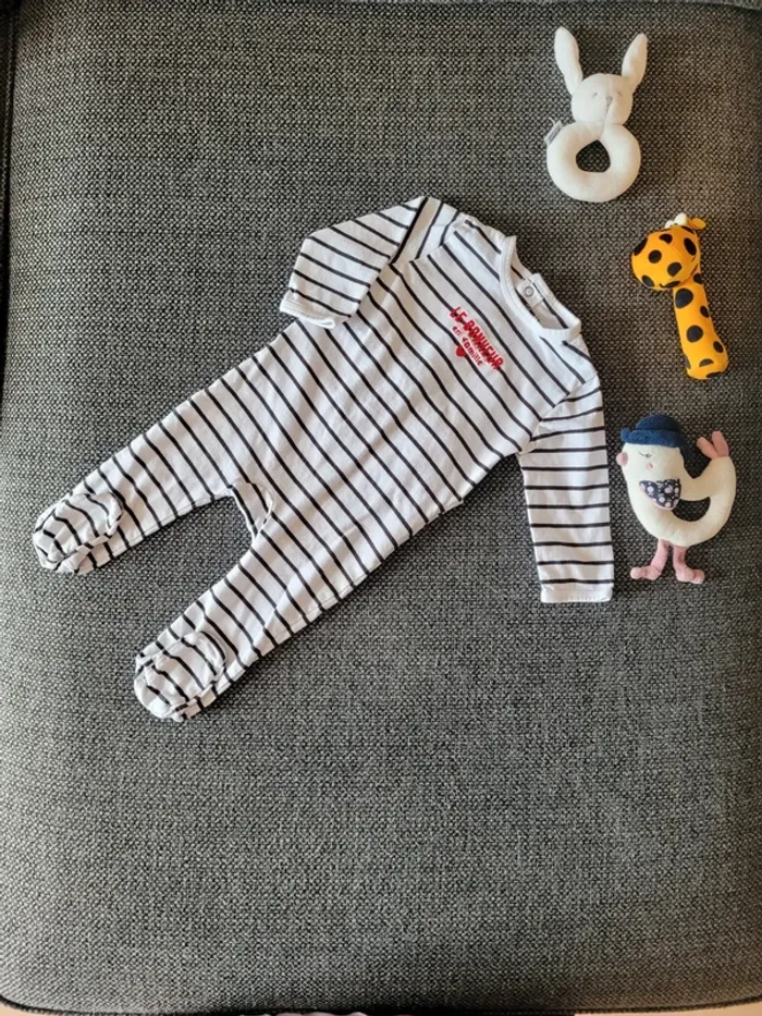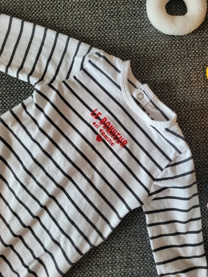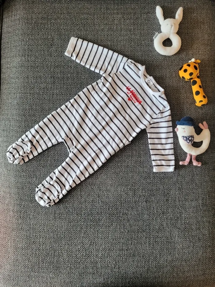 Pyjama mixte en coton de taille 6 mois et de la marque Kiabi Blanc à rayures noires et écritures brodées rouges Aucune tâche ni trou Très peu porté donc comme neuf #mabi38780garcon6mois #mabi38780mixte6mois #mabi38780fille6mois