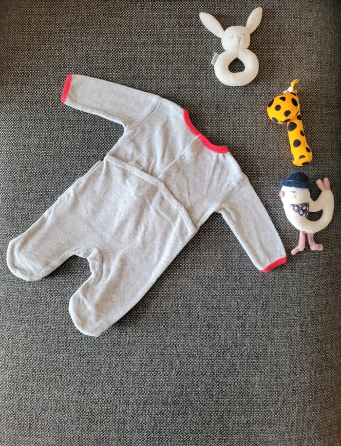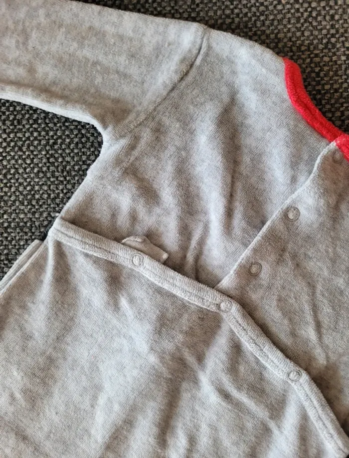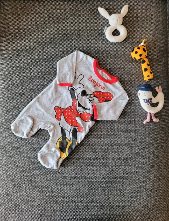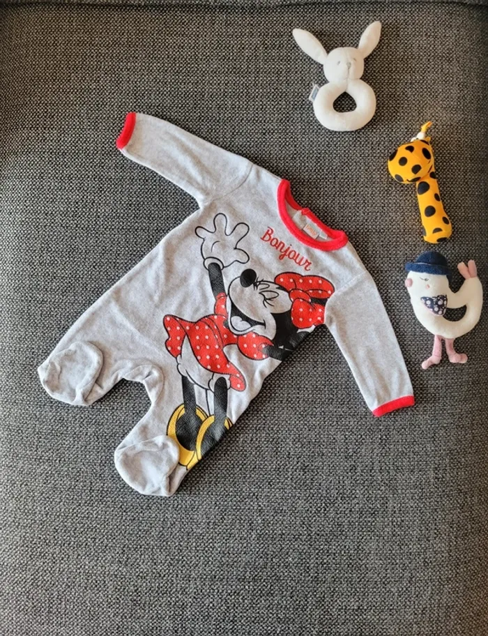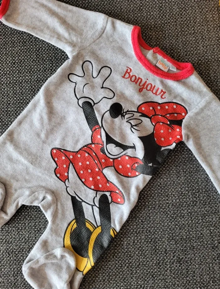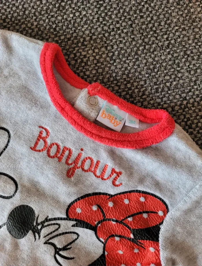 Pyjama pour fille Minnie en velours de taille 3 mois Gris à bordures rouges Aucune tâche ni trou. Juste un défaut sur la pression côté gauche mais qui ne gêne pas l'utilisation (voir photos) #mabi38780fille3mois