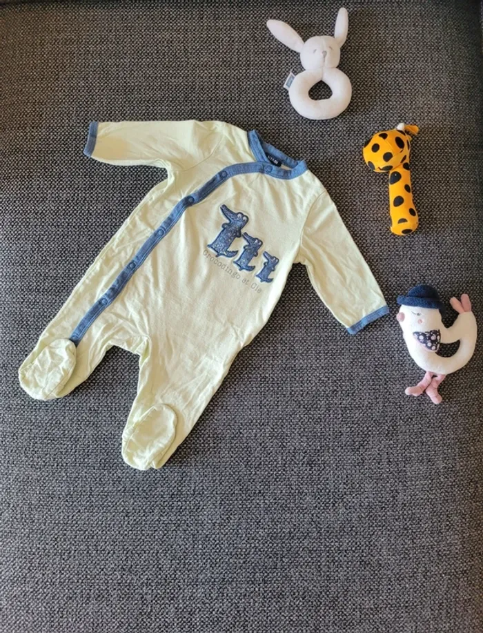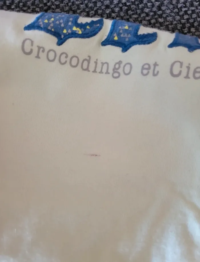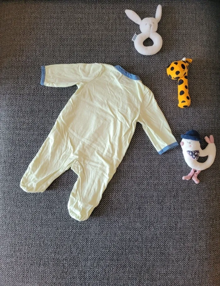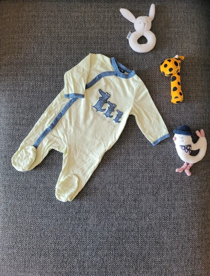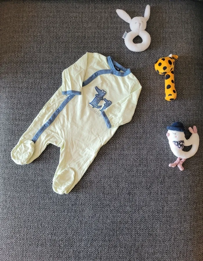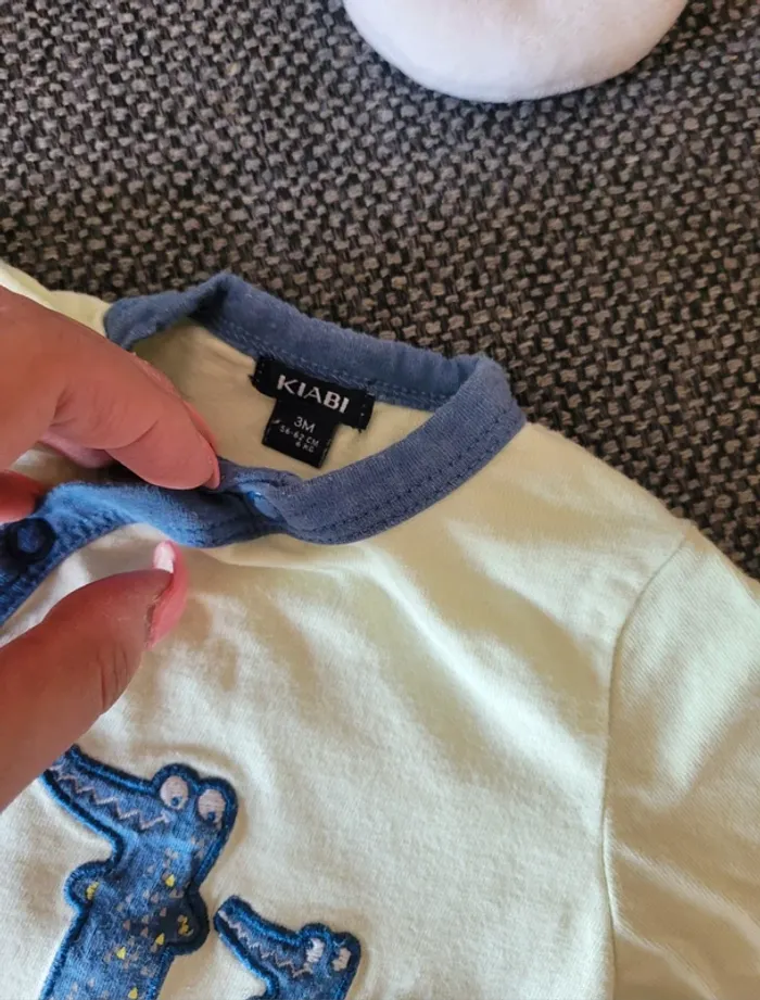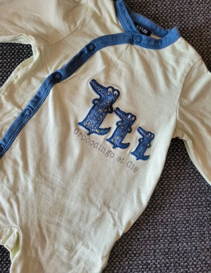 Pyjama pour garçon en coton de taille 3 mois et de la marque Kiabi Vert clair à bordures bleues avec motifs crocodiles Aucune tâche ni trou sauf devant où il y a une légère trace (voir photos) #mabi38780garcon3mois