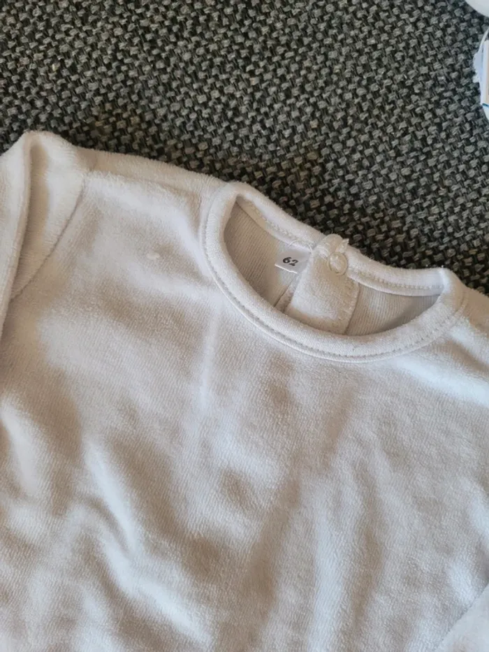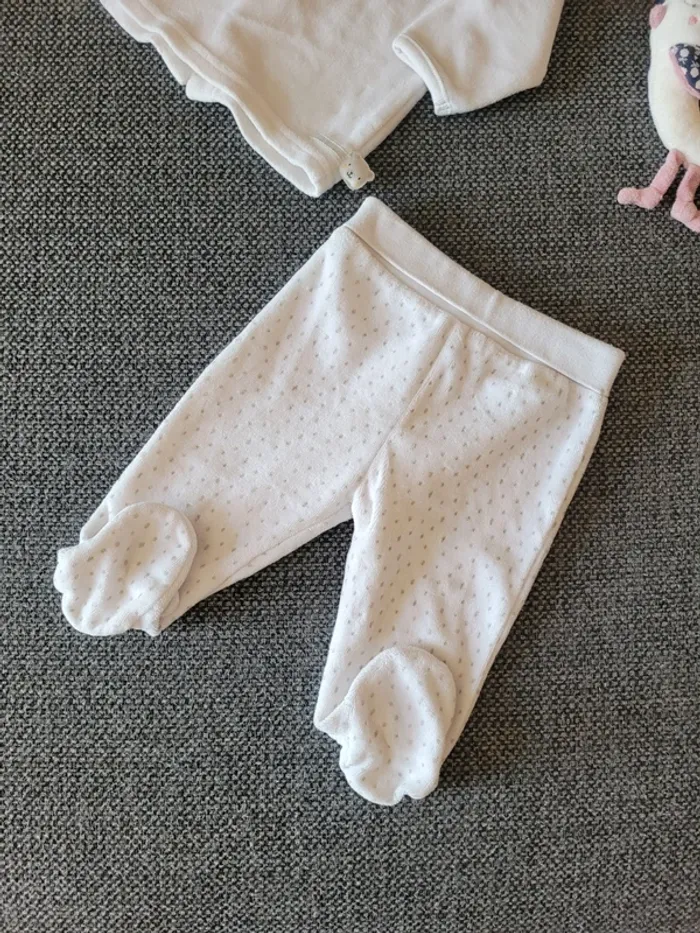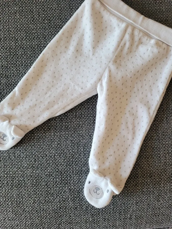 Pyjama mixte en velours de taille 62 cm (équivalent 3 mois) Blanc et à pois gris avec tête d'ours sur les pieds pour le bas Aucune tâche ni trou #mabi38780mixte3mois #mabi38780garcon3mois #mabi38780fille3mois